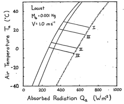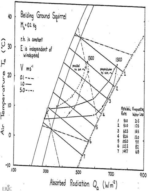 If the animal were simply resting outside, to reduce its metabolism to the lowest levels. it should be active from 1100 to 1500 hours. The reason to go above ground, however, is for activity. Therefore, if metabolic rate increases 1.5 times, preferred activity times should shift to 800-1000 or 1500-1600 hours. It is hard to say much about water loss when the animal is active. According to the figure, if \(M\) increases to \(82 W m^{-2}\) then \(E\) drops. But if respiration rate increases with activity then \(E\) may also increase. Morhardt and Gates considered a wide variety of above-ground habitats. A shaded environment gave much lower radiation loads during the day. If the animal orients its body parallel to the sun, this lowers \(Q_a\) also. A great deal more could have been said about the thermoregulation strategies if the thermal environment of the burrows were monitored and if microhabitat usage and body temperature as a function of time of day had been recorded. One would predict that shaded environments including the burrow would be used more in the middle of the day. To test this, one would have to make hourly observations on microhabitat usage.