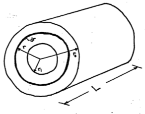 \[\begin{align} q_c &= -kA\frac{dT}{dr} \notag \\ A &= 2\pi rL \notag \\ q_c &= -k 2\pi rL \frac{dT}{dr} \notag \\ dT &= -\frac{q_c}{2\pi Lk}\frac{dr}{r} \notag \\ \int^{T_0}_{T_i}dT &= -\frac{q_c}{2\pi Lk}\int^{r_0}_{r_i}\frac{dr}{r} \notag \\ T_0 - T_i &= \frac{-q}{2\pi Lk}\ln(\frac{r_0}{r_i}) \notag \\ q_c &= \frac{2\pi Lk}{\ln(\frac{r_0}{r_1})}(T_i-T_0) \tag{9.17} \end{align}\]