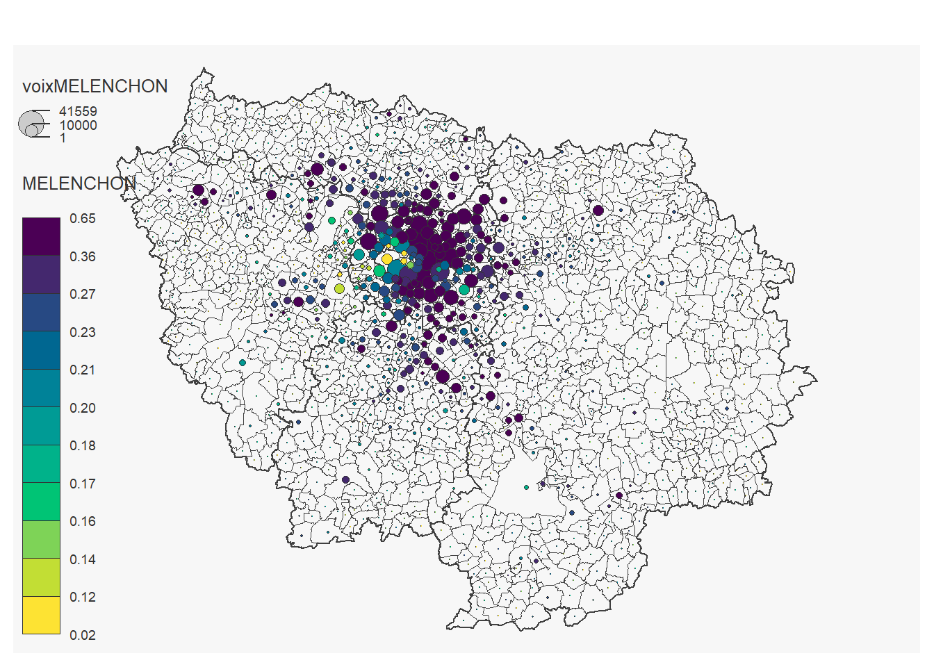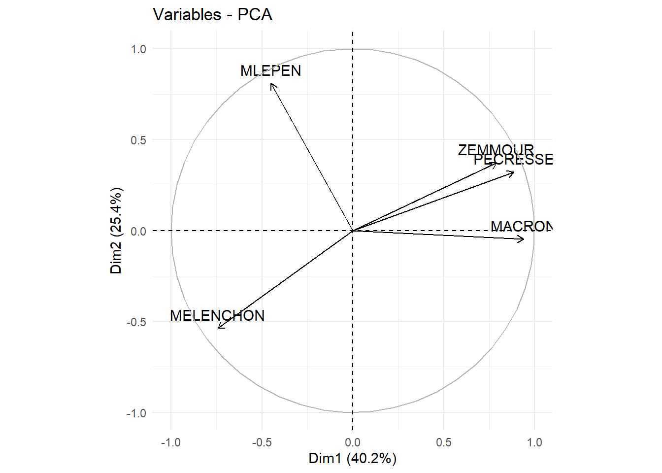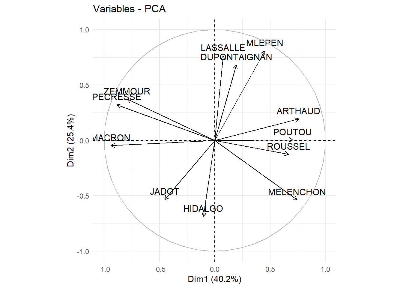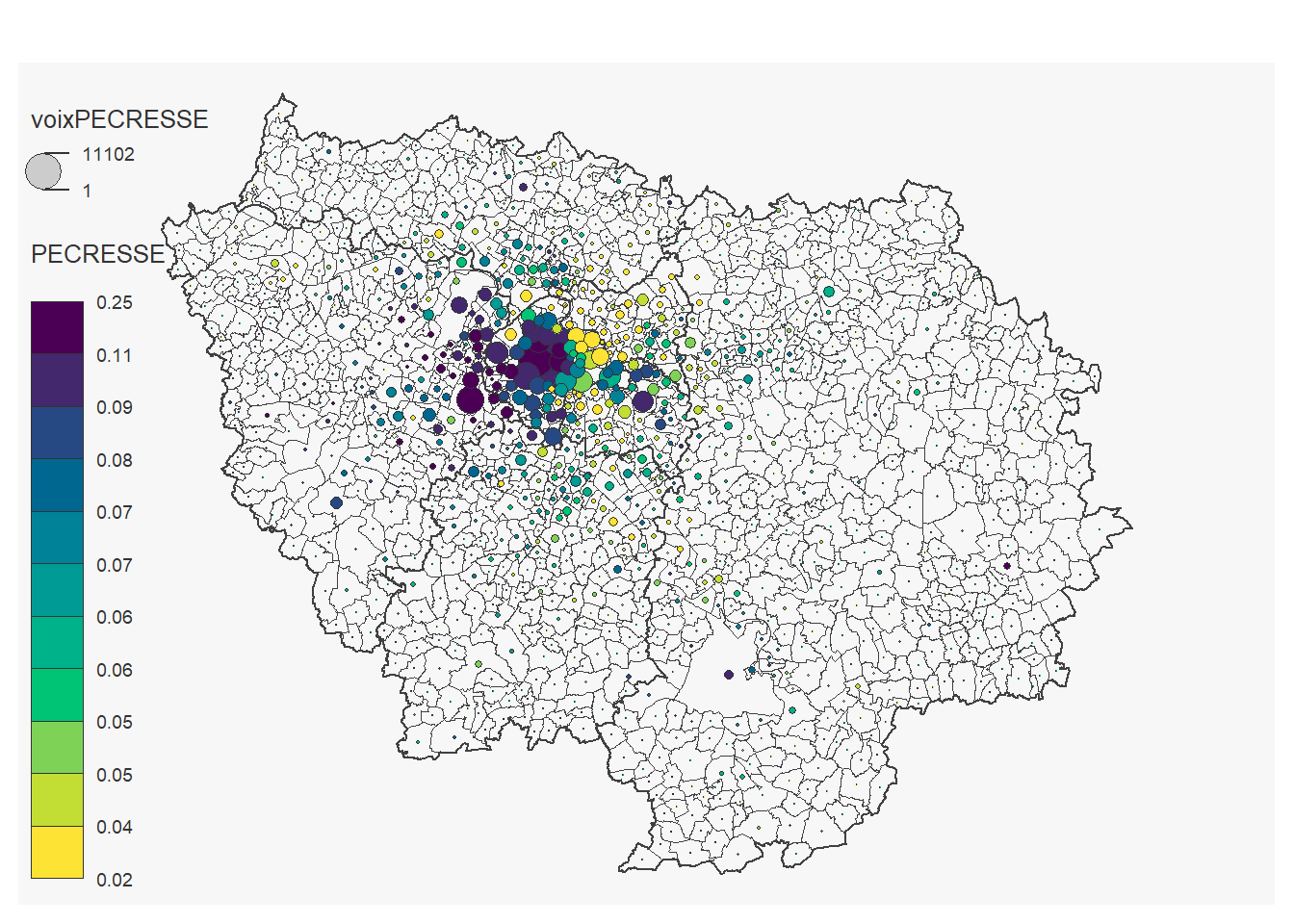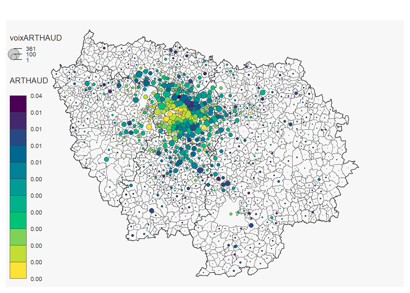 Dans le cas ici, on va plutôt réaliser une ACP suivant le premier objectif sur les votes exprimés aux élections en Île de France aux élections présidentielles de 2022. L’objectif sera de voir on retrouve des structures dans la géographie de cette élection.