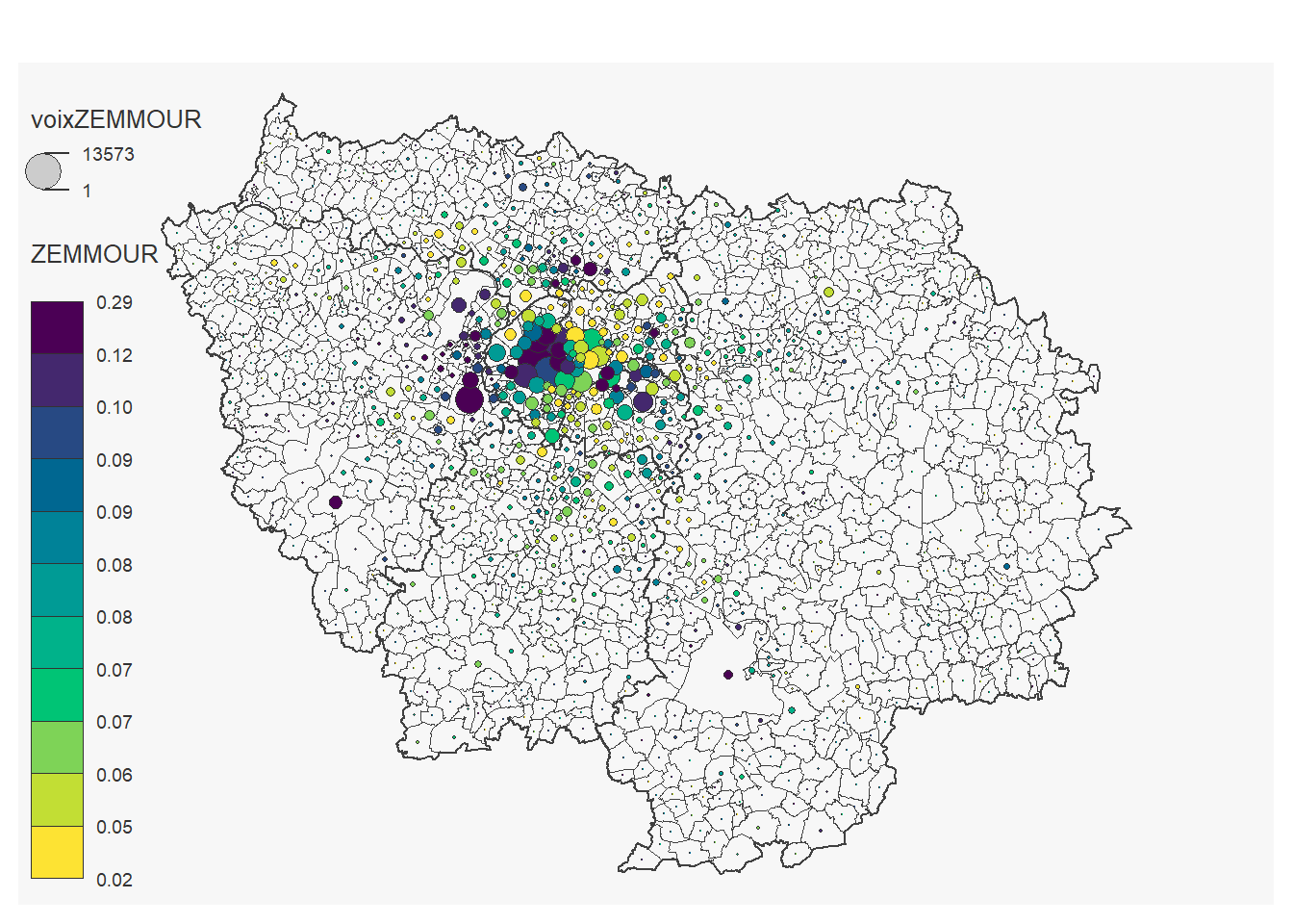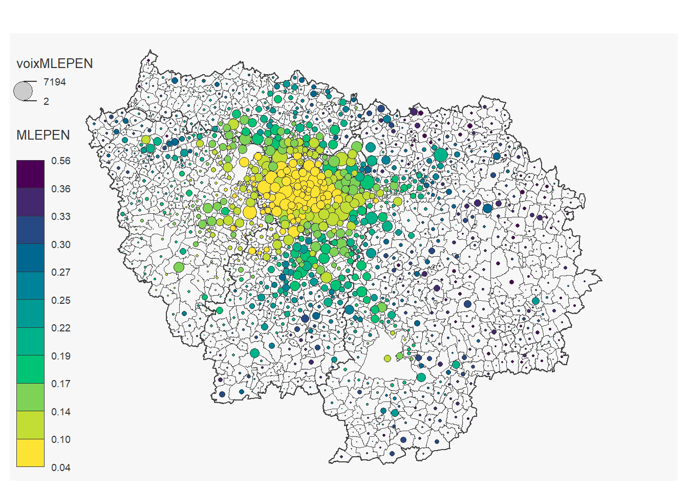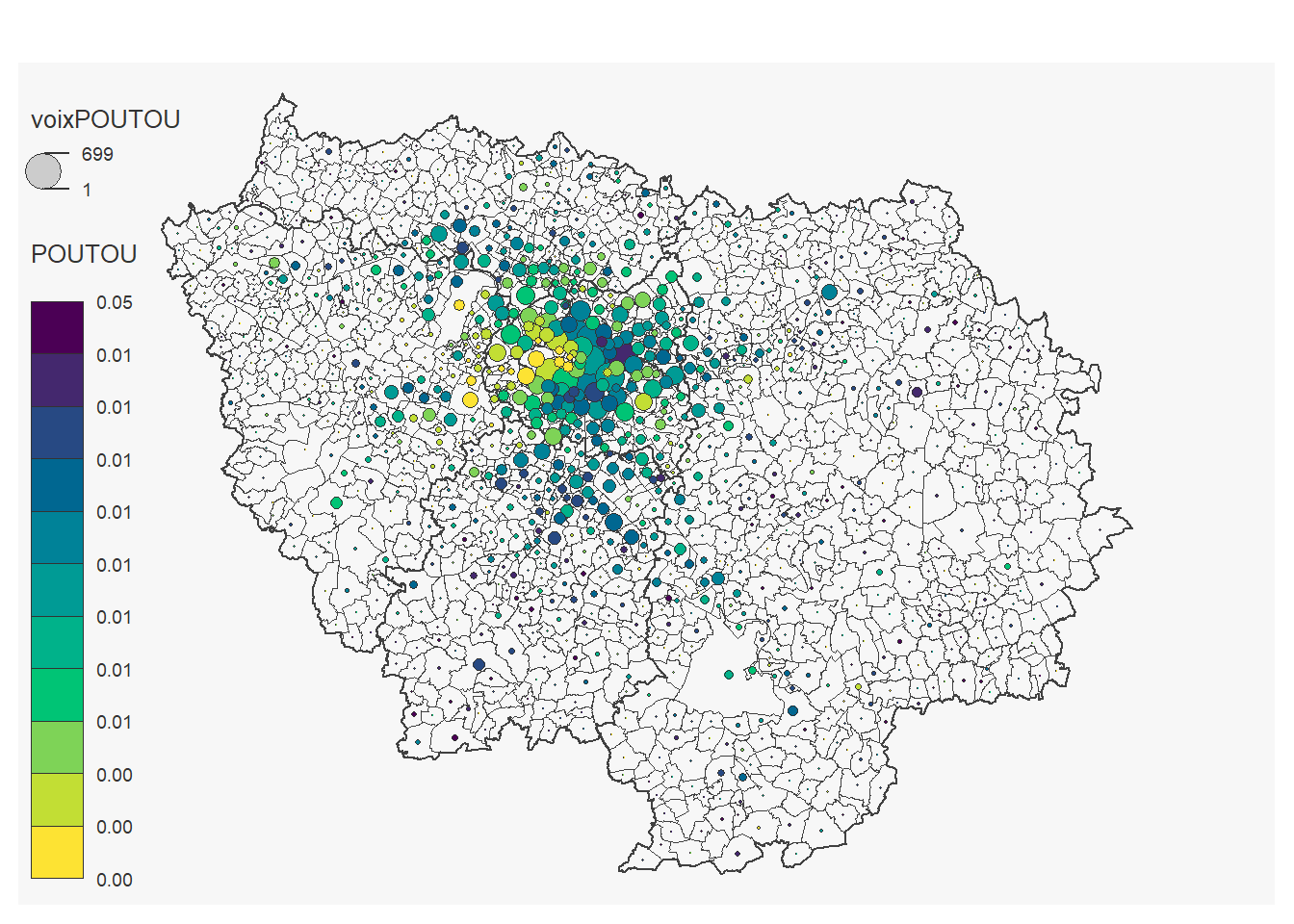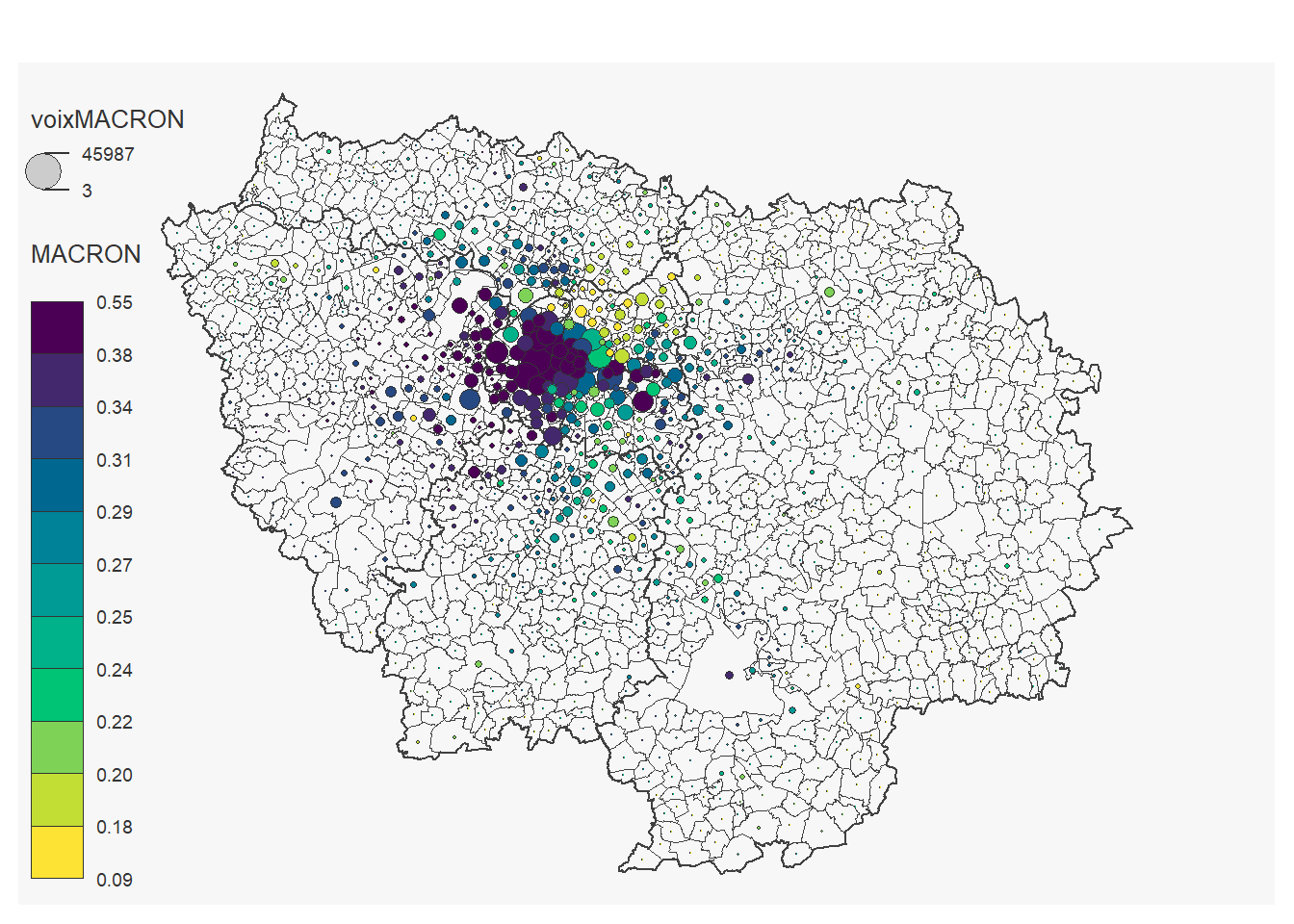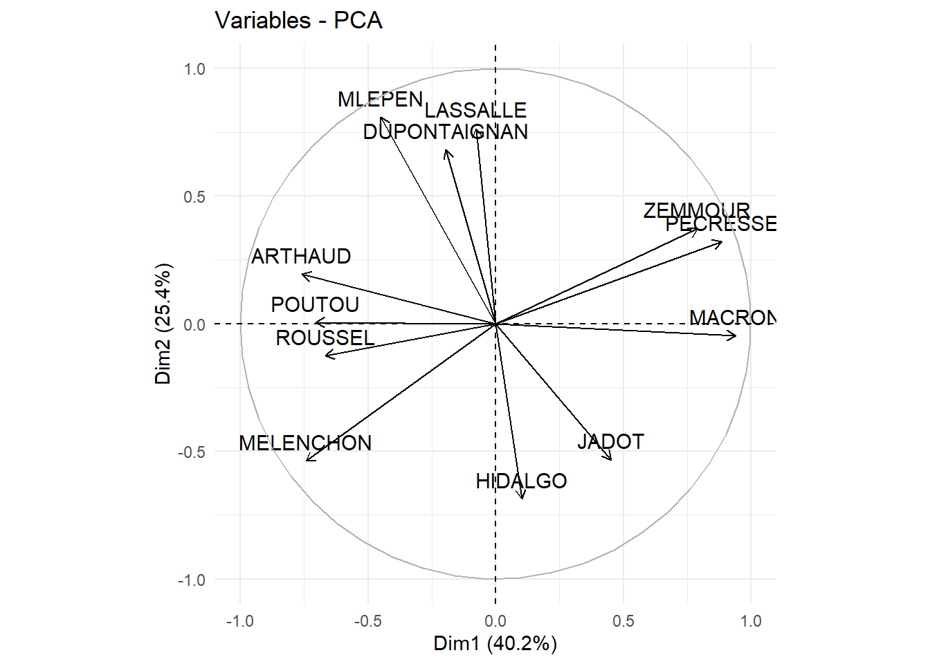 Dans le cas ici, on va plutôt réaliser une ACP suivant le premier objectif sur les votes exprimés aux élections en Île de France aux élections présidentielles de 2022. L’objectif sera de voir on retrouve des structures dans la géographie de cette élection.