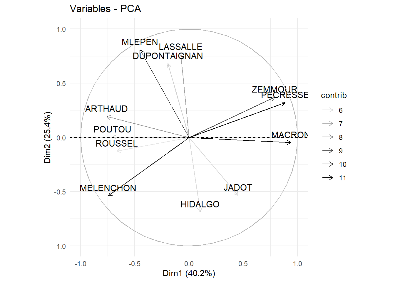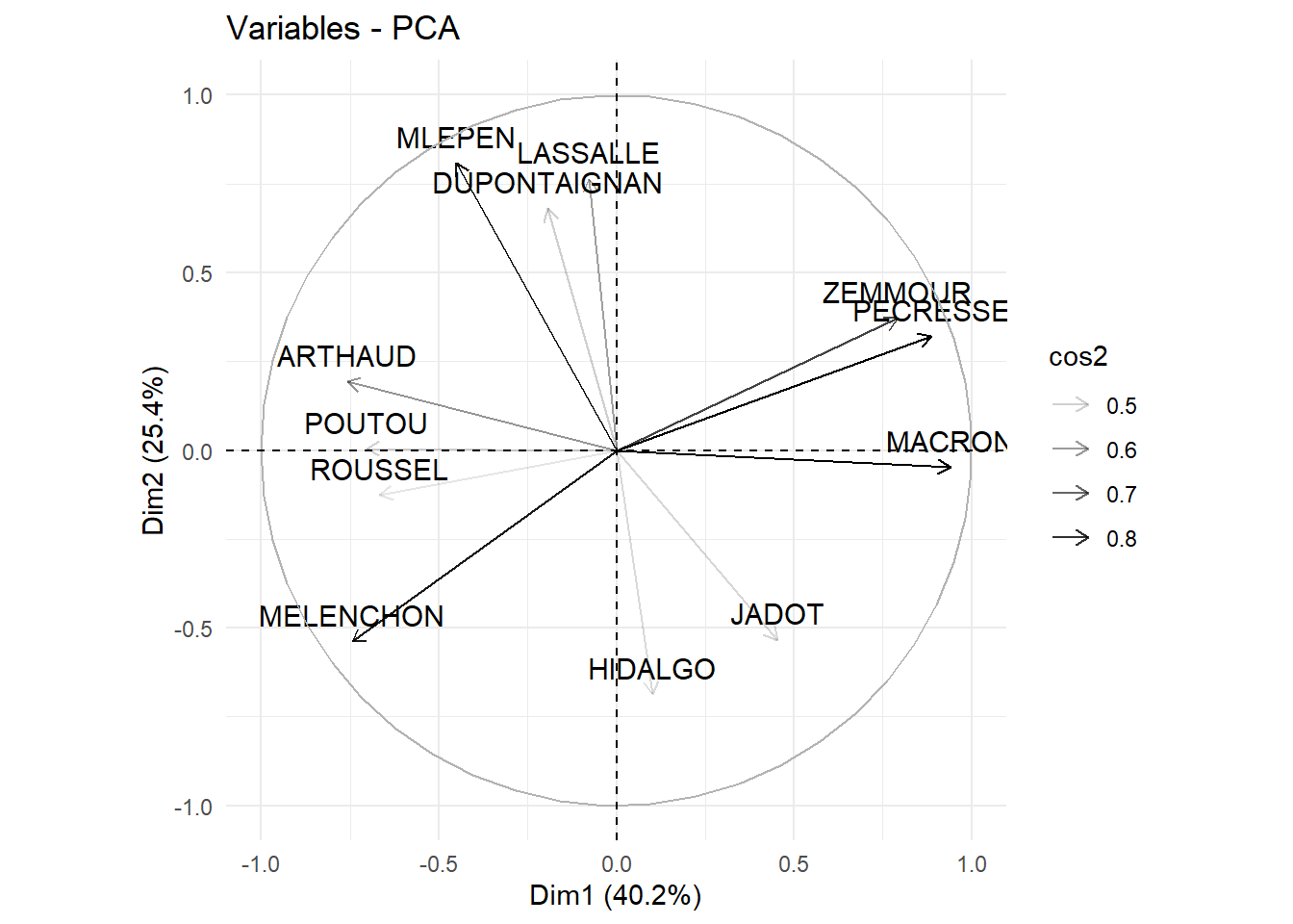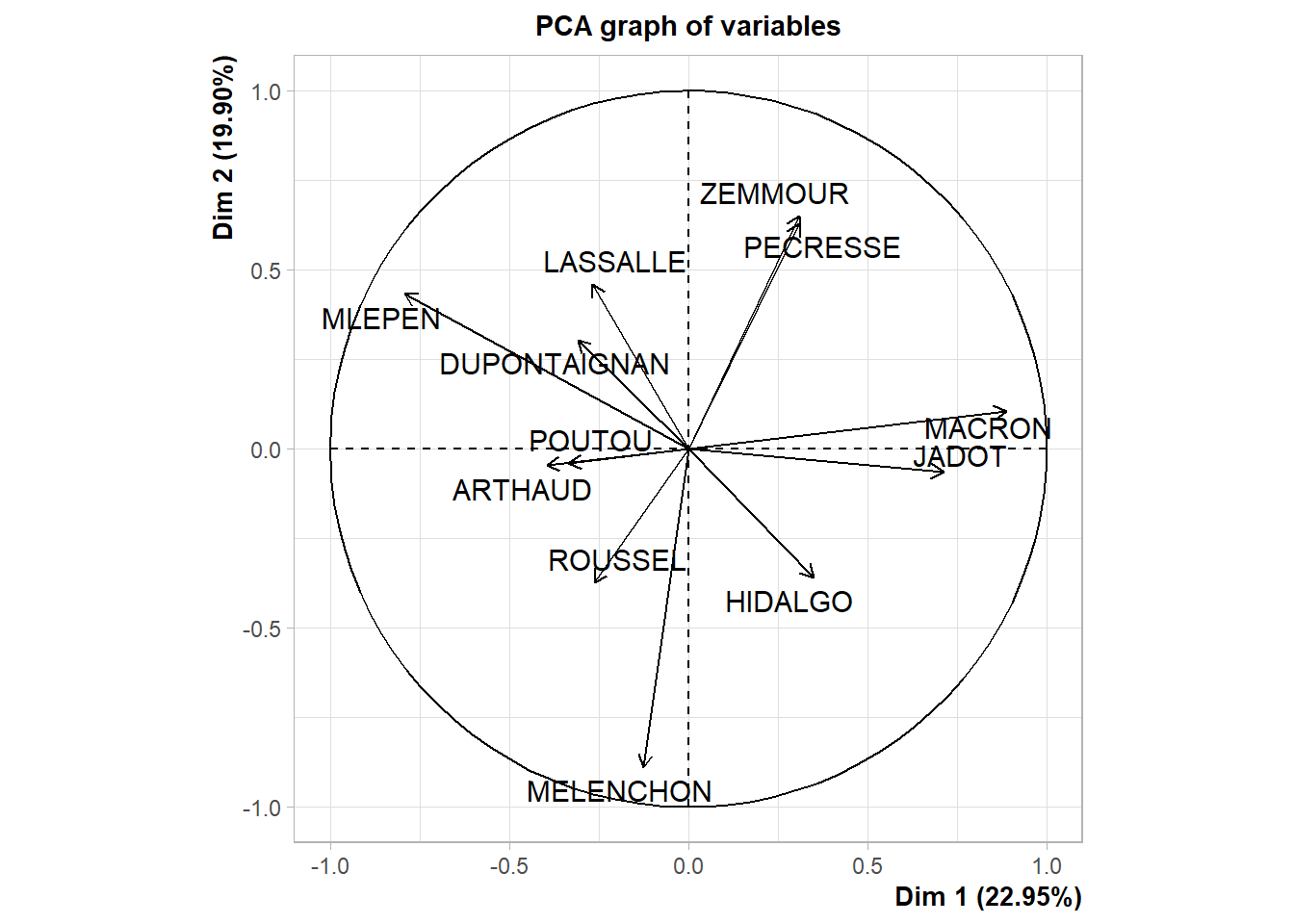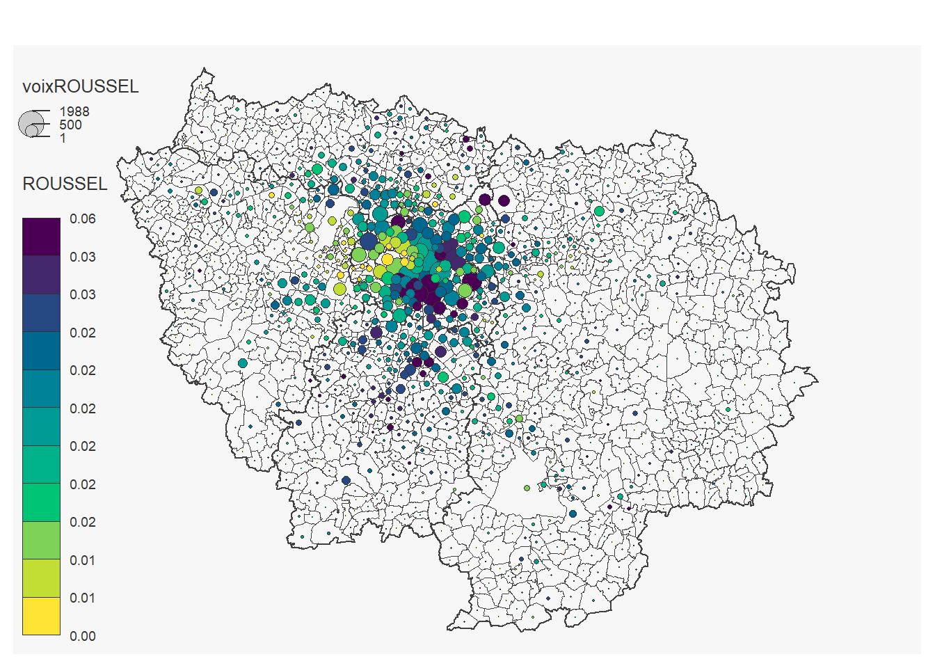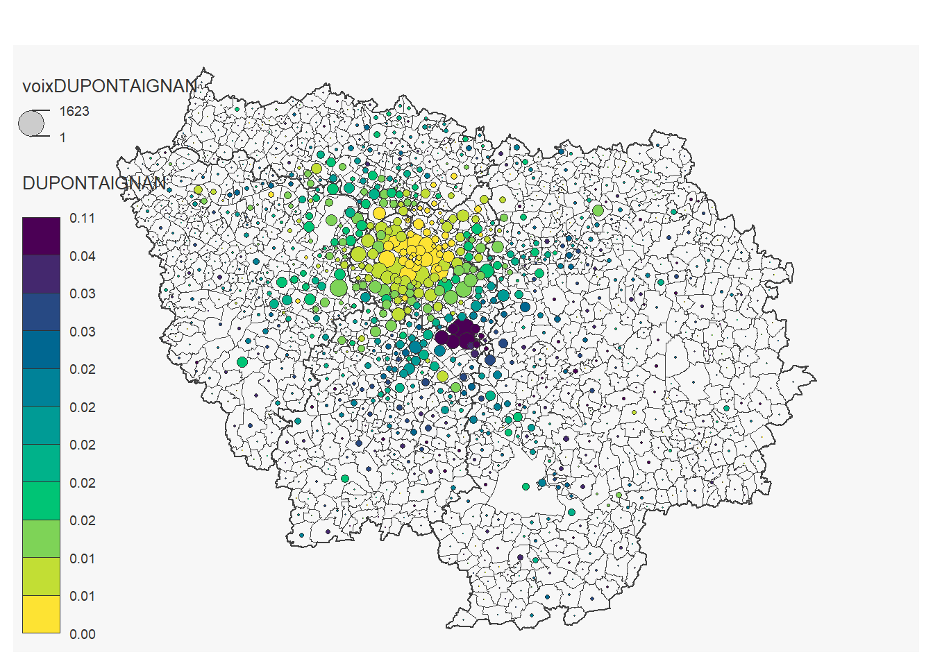 Dans le cas ici, on va plutôt réaliser une ACP suivant le premier objectif sur les votes exprimés aux élections en Île de France aux élections présidentielles de 2022. L’objectif sera de voir on retrouve des structures dans la géographie de cette élection.
