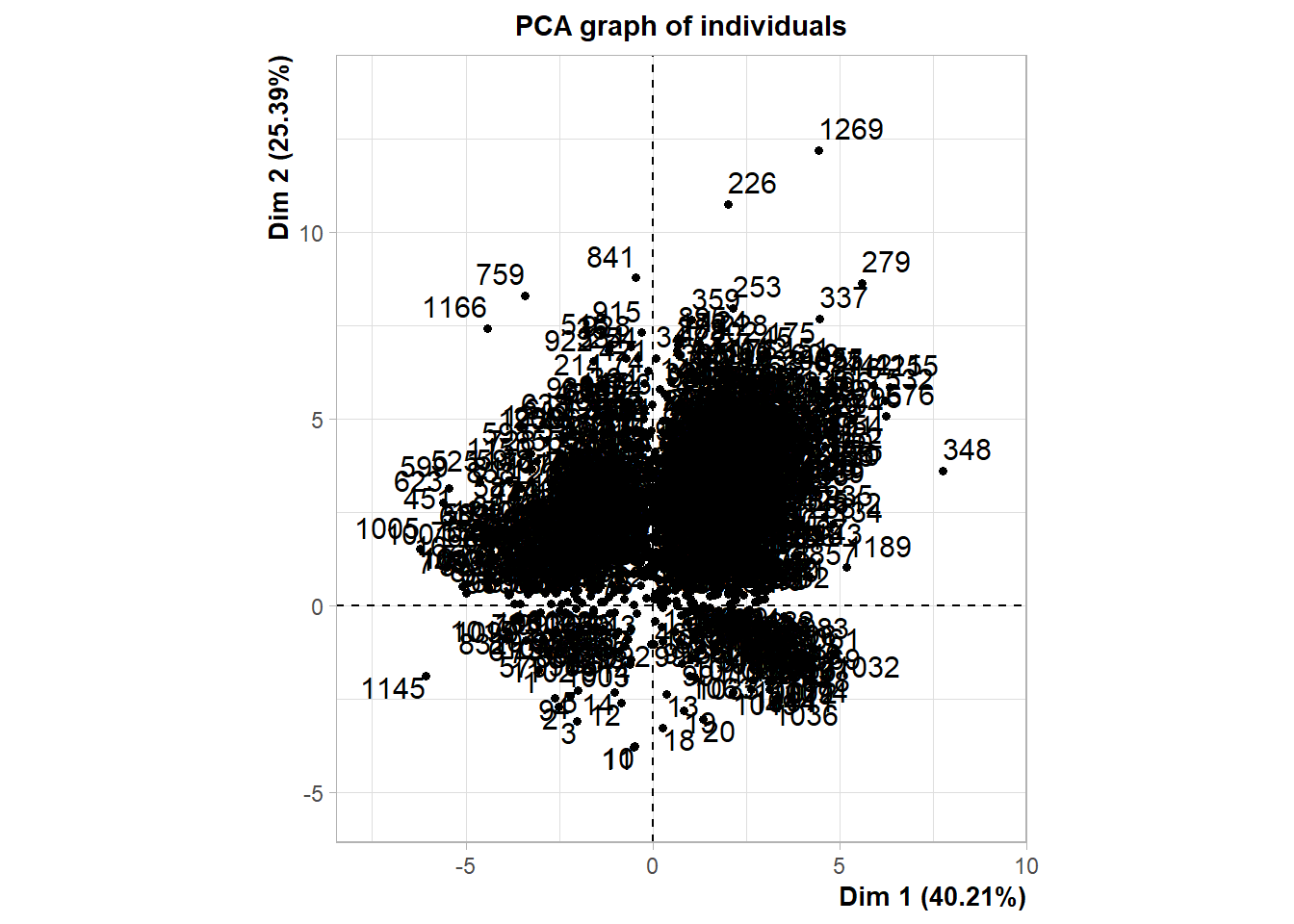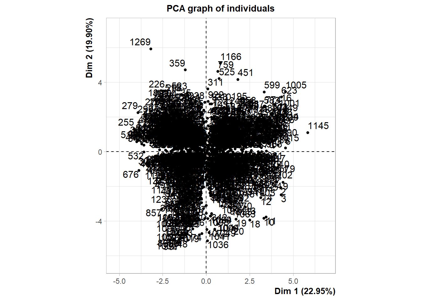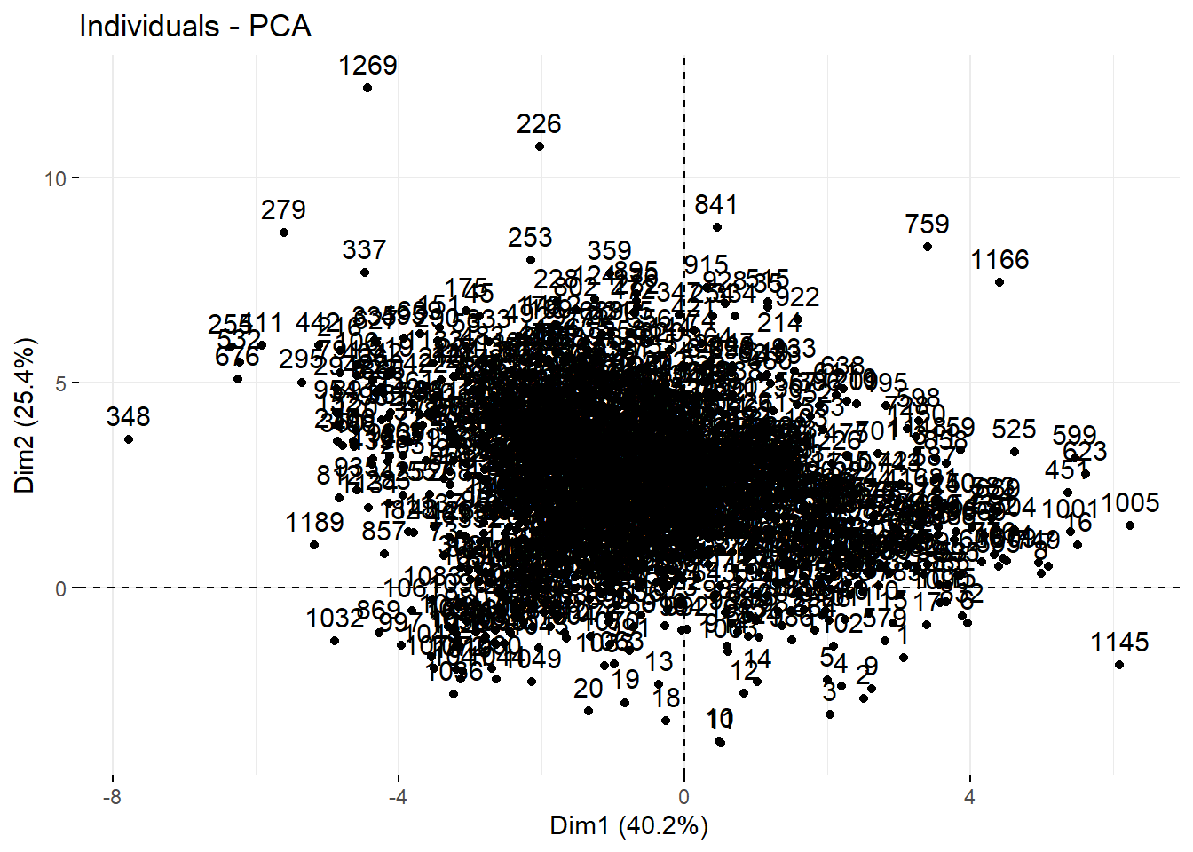 On peut récupérer les score de chaque individus en collant avec bind_rows les coordonnées avec le set de données initiale. On doit utiliser ici bind_rows plutôt qu’une jointure (left_join, right_join) parce que l’agorythme de FactoMineR ne conserve pas d’ID lors de la réalisation de l’ACP mais il conserve bien l’ordre des lignes mise en entrée: