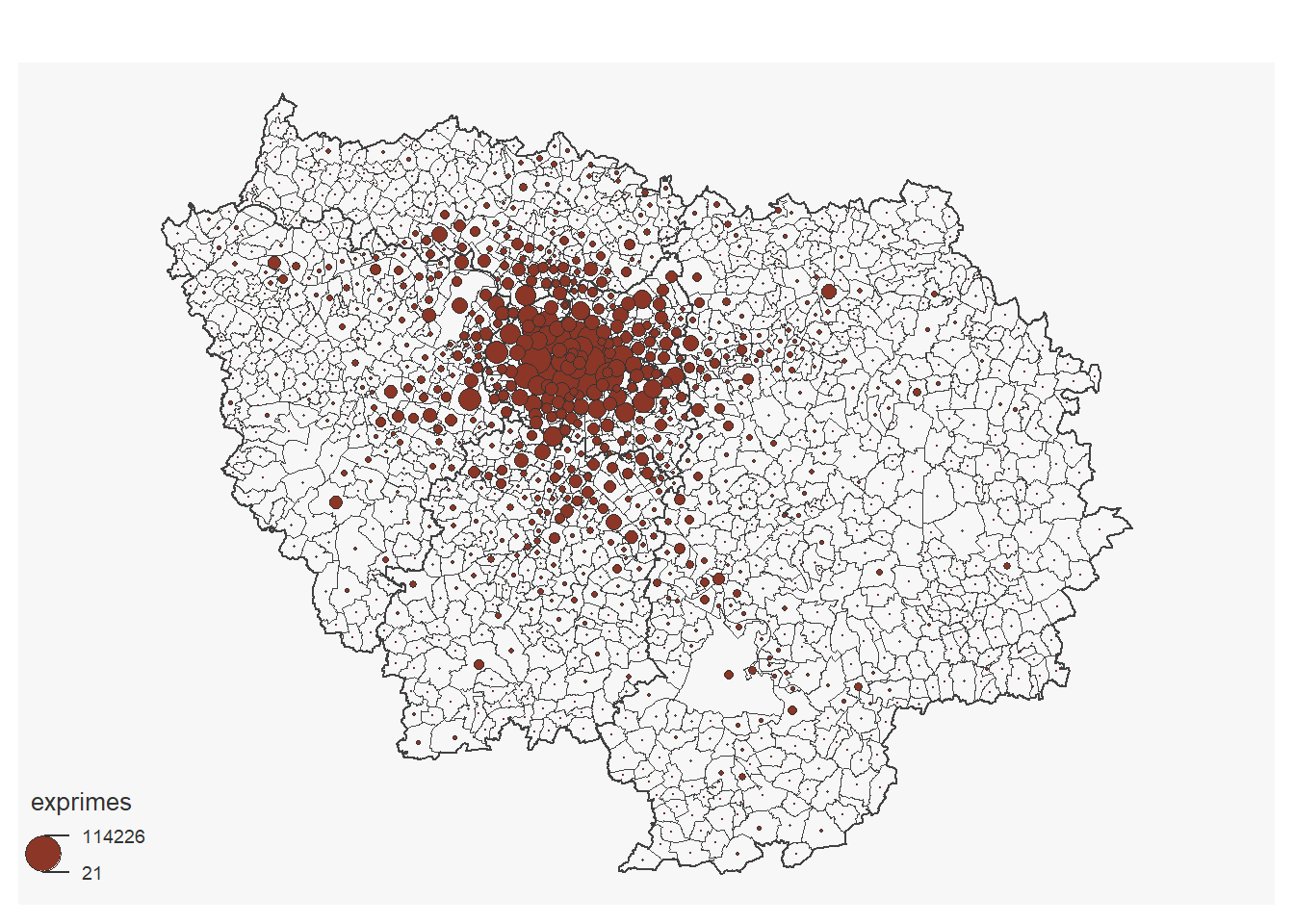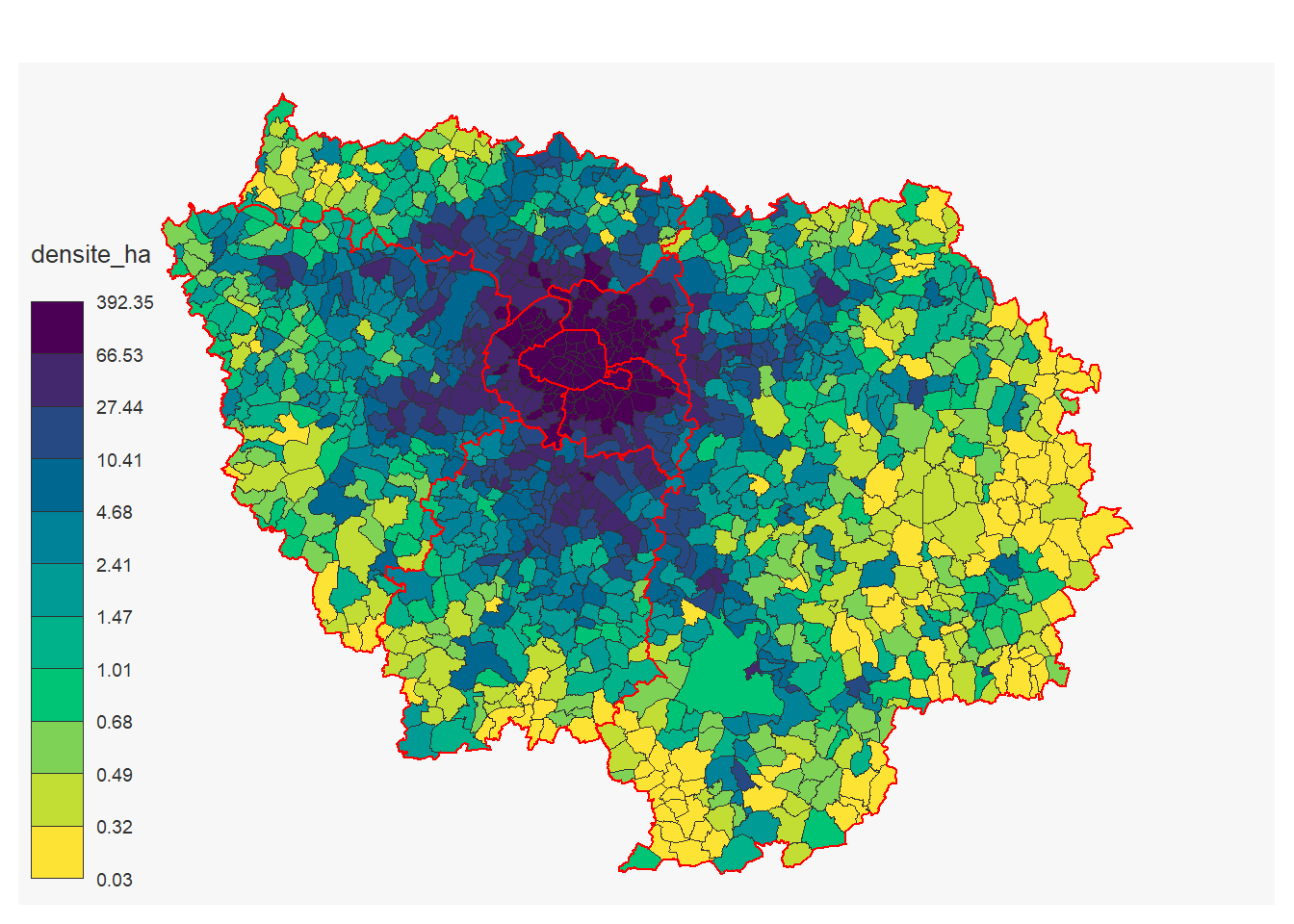 filter(`Code région`=="11") # on garde que la France métropolitaineOn joint avec le fichier spatial des communes et calcul la densité de population