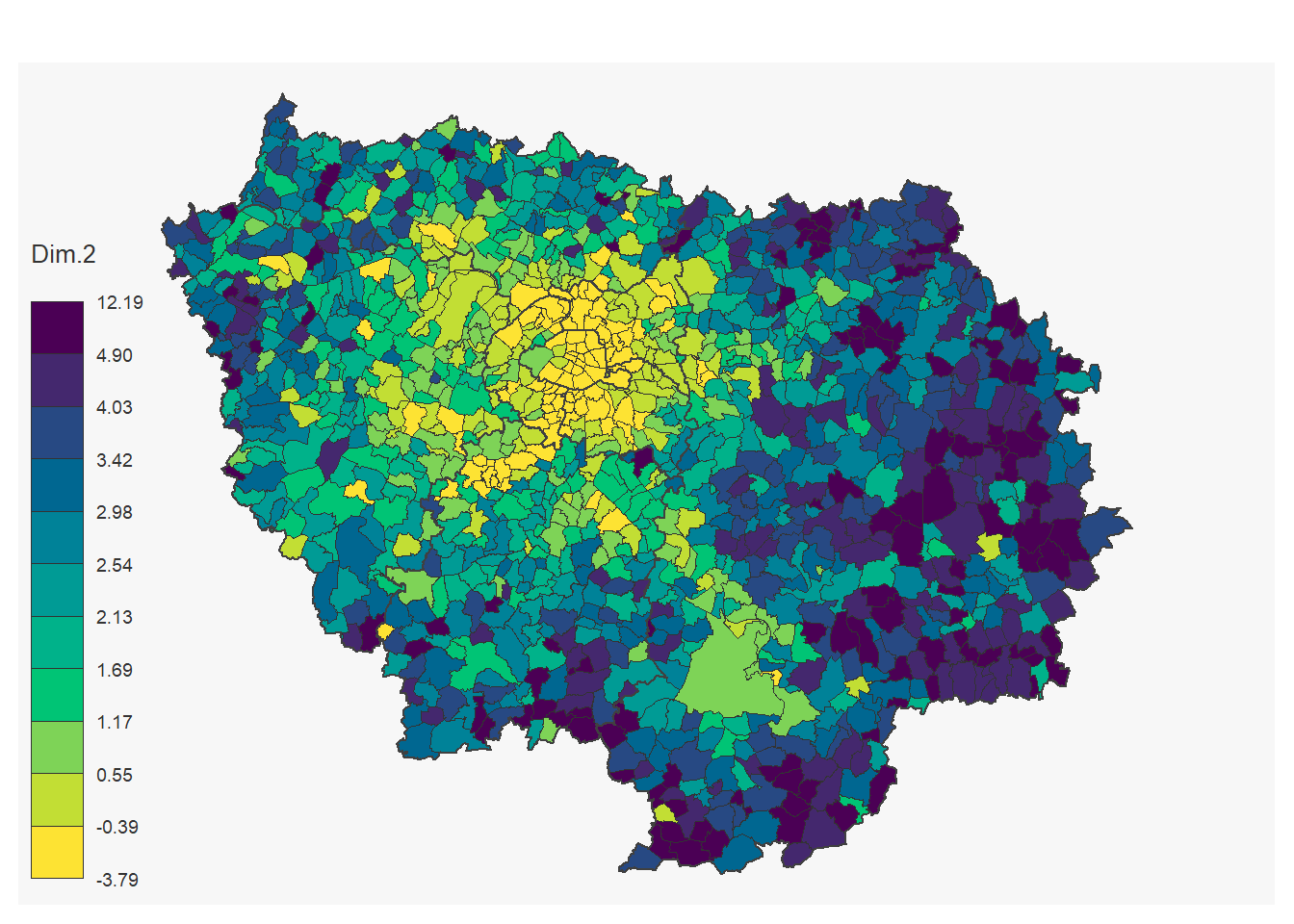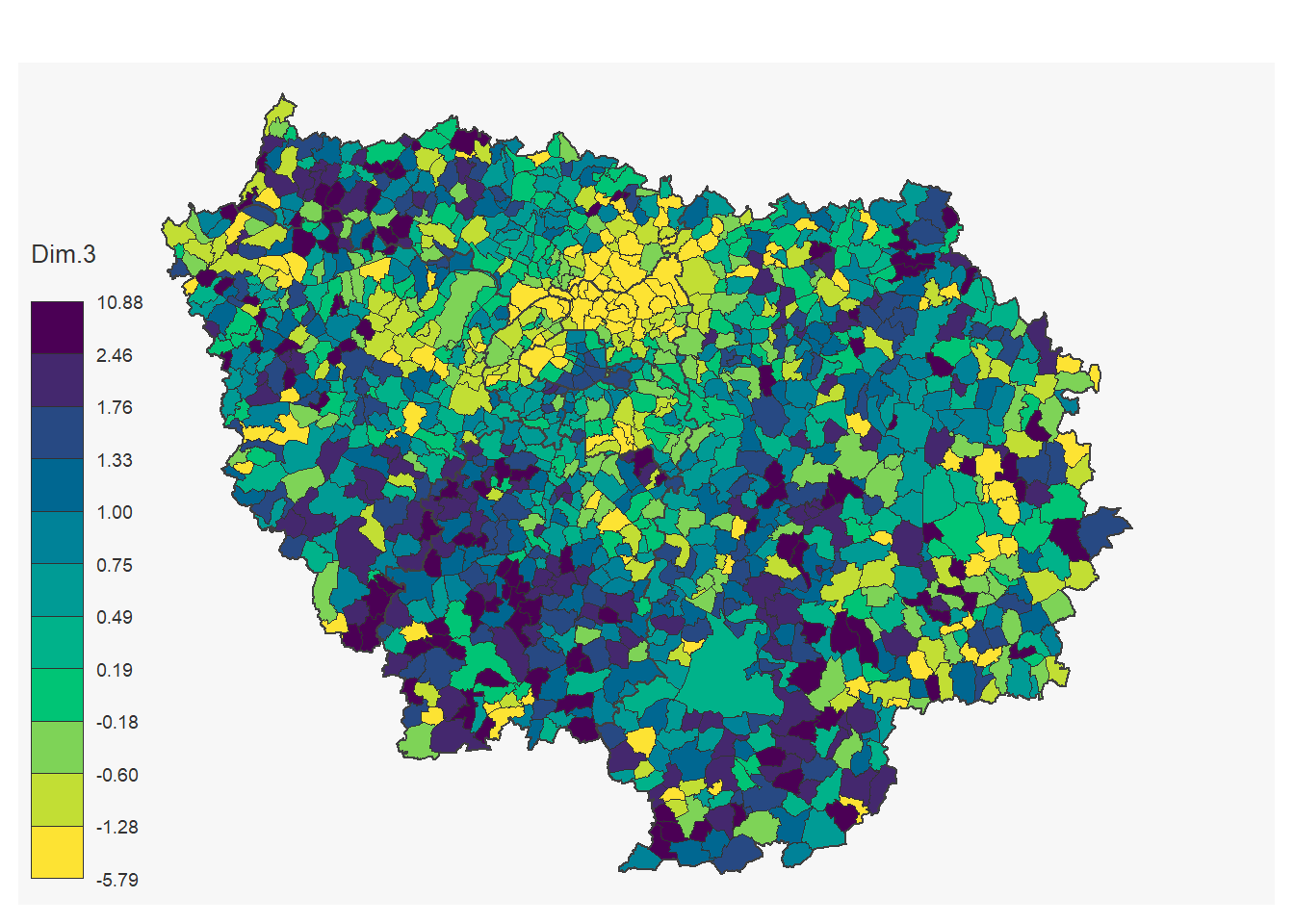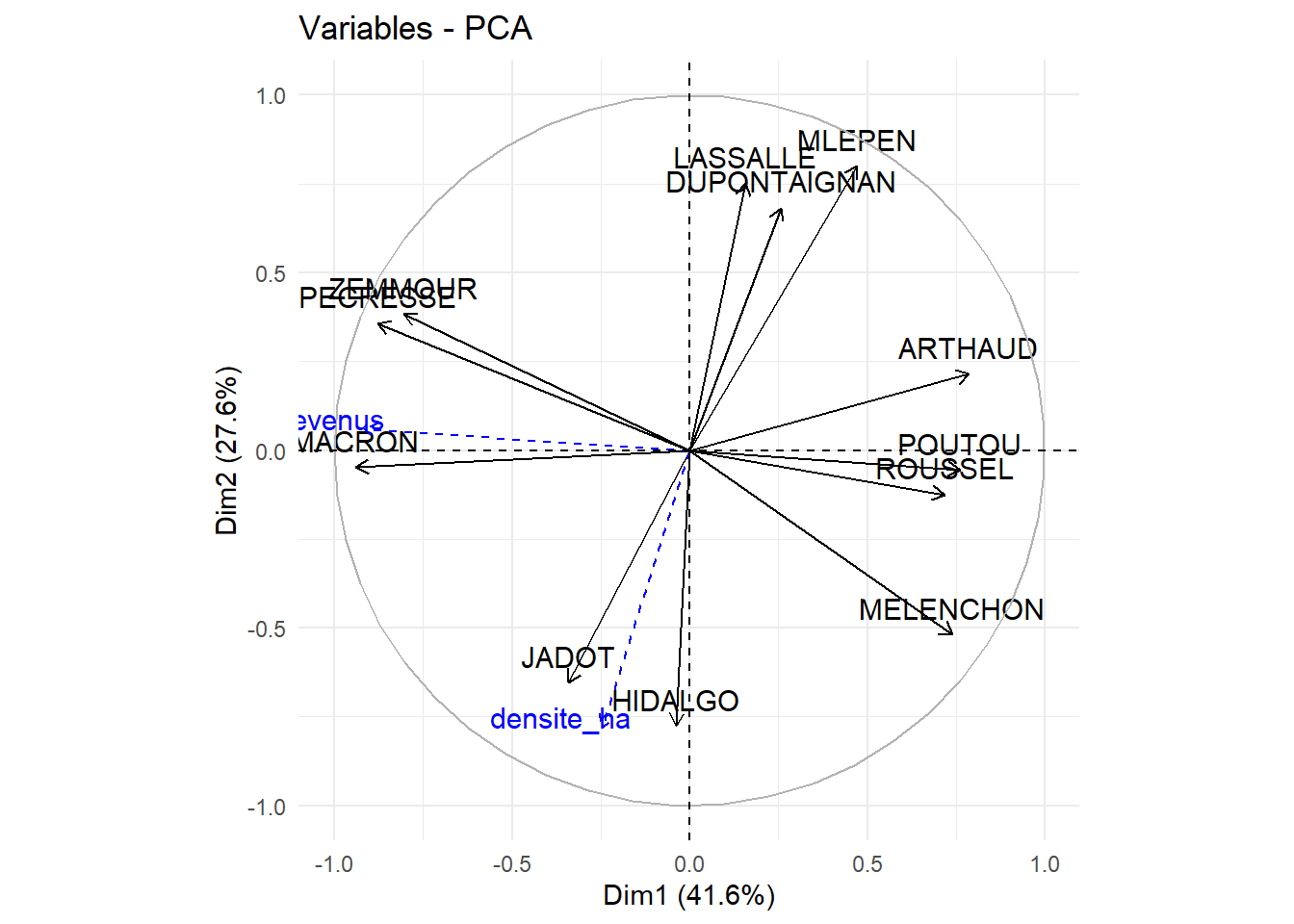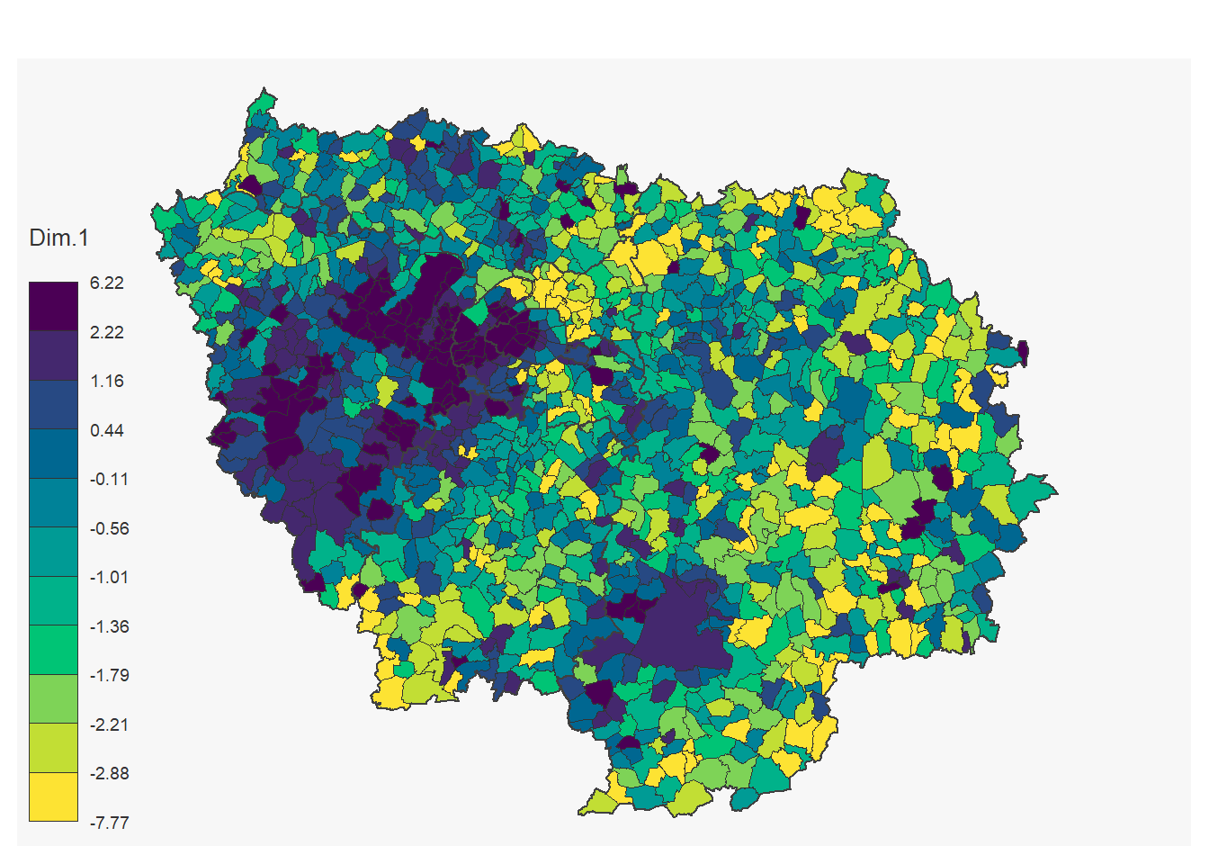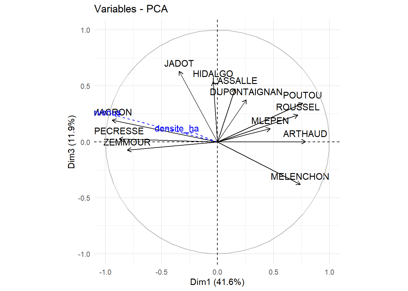 rm(cercle_1_3)On observe des fortes corrélations entre la première dimension qui dépeind une opposition gauche-droite et la variable de revenus, les revenus élevés étant associés aux communes où le vote de droite est important. La seconde dimension est quant à elle fortement corrélée à la densité de population et permet d’interprétée cette dernière comme l’opposition centre urbain-périphérie