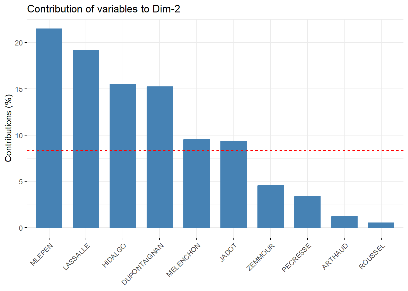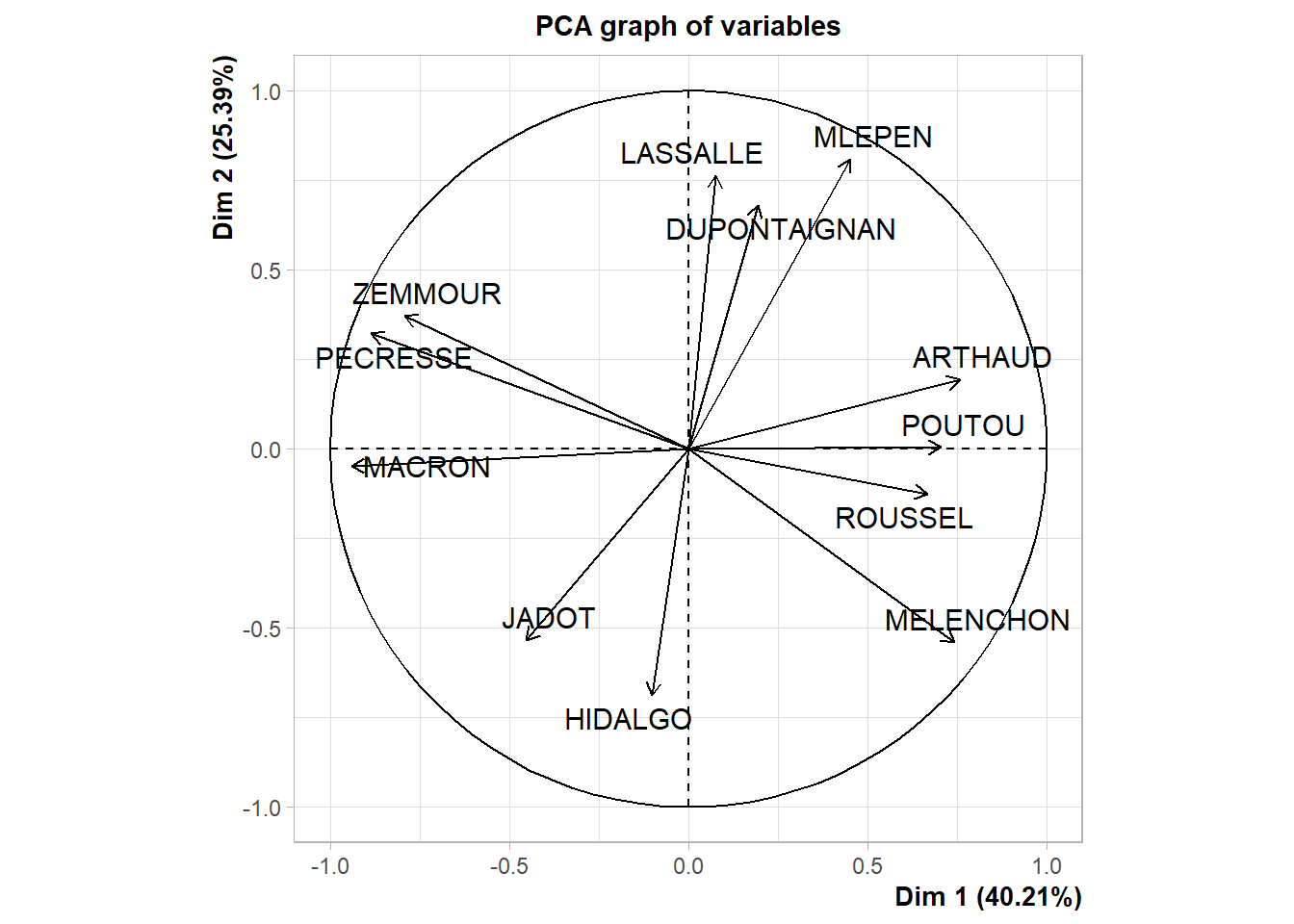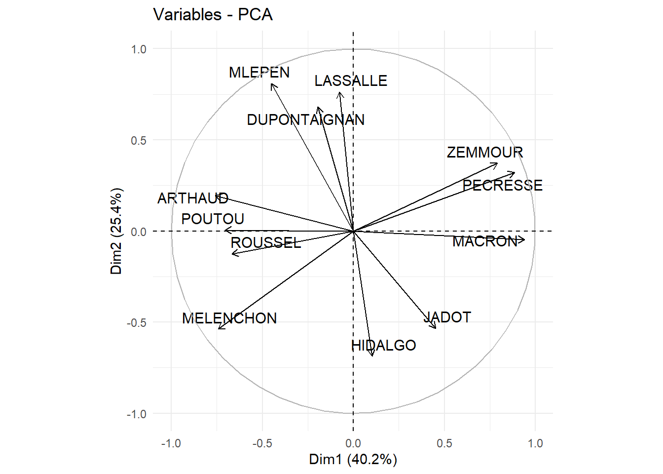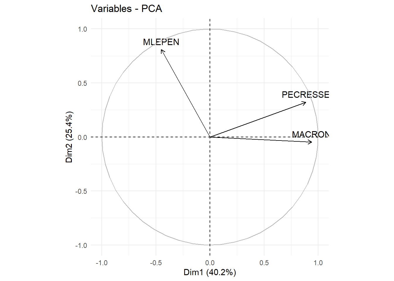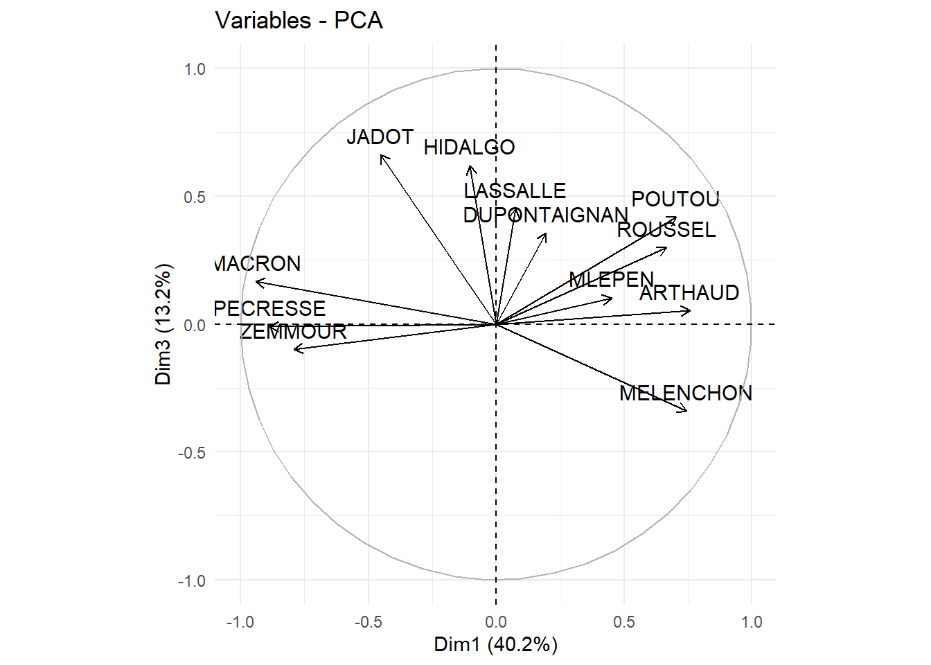 rm(cercle_1_3)On observe des fortes corrélations entre la première dimension qui dépeind une opposition gauche-droite et la variable de revenus, les revenus élevés étant associés aux communes où le vote de droite est important. La seconde dimension est quant à elle fortement corrélée à la densité de population et permet d’interprétée cette dernière comme l’opposition centre urbain-périphérie