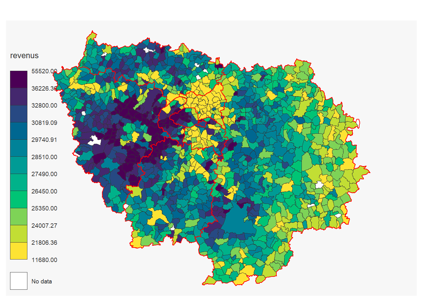 select(CODGEO, revenus)On joint avec le fichier spatial des communes et les revenus: