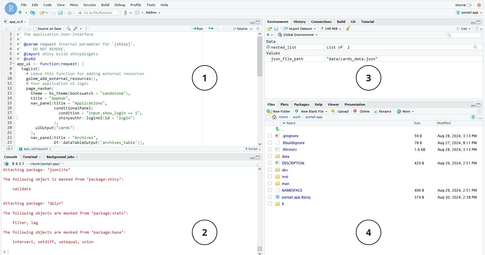 L’organisation en quatre fenêtres permet de garder une vue d’ensemble sur vos fichiers, votre code, et vos résultats, facilitant ainsi la navigation et l’efficacité dans vos projets R.