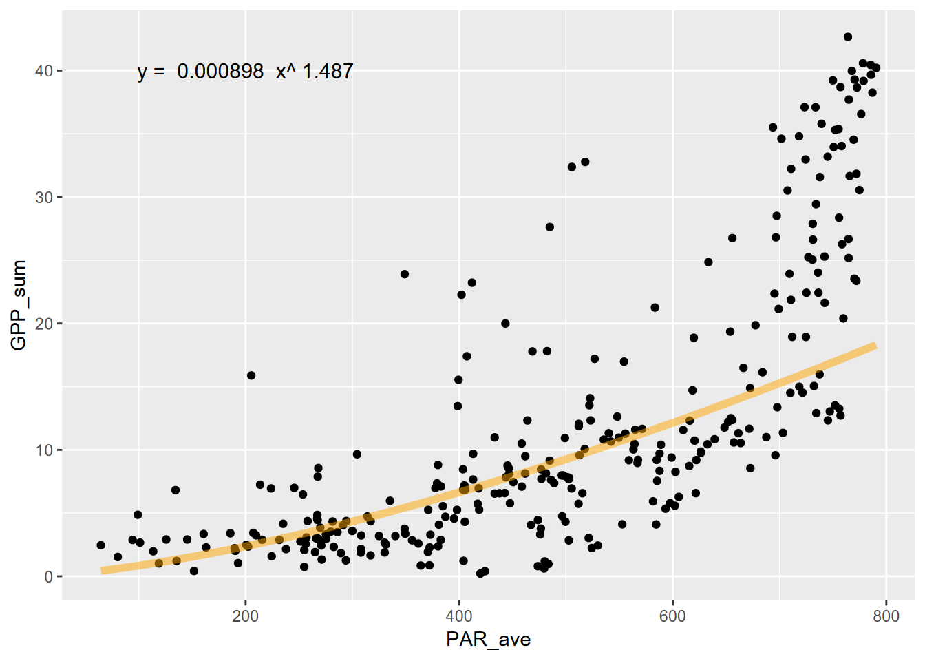 fit_eq = paste("GPP = ", round(coeff,4), round(slope,5), "^PAR")