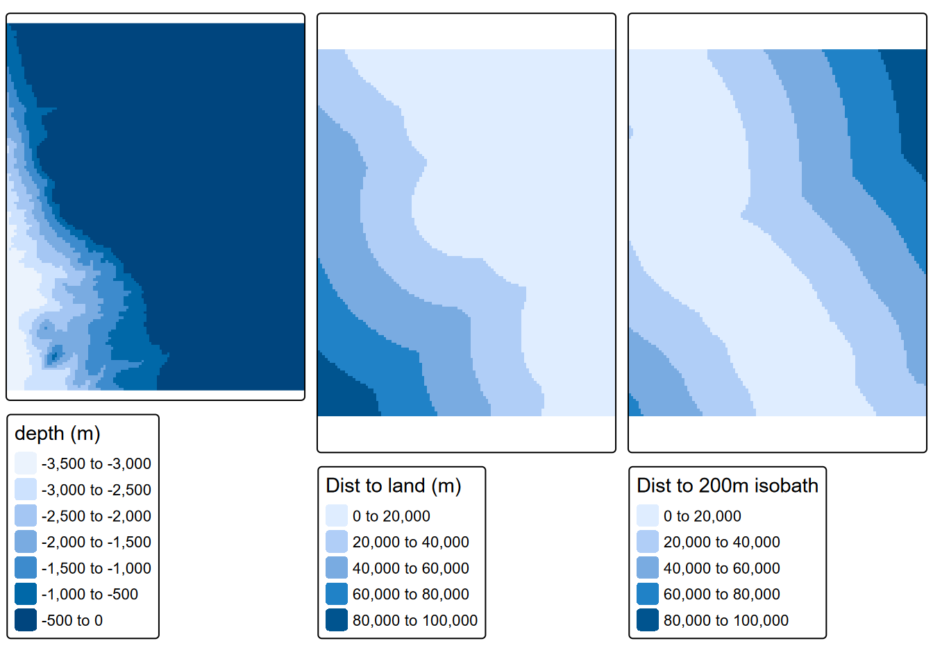 We have a depth raster at 200-m resolution, but for our purposes and at this scale we only need 1000-m (1-km) resolution. We’ll create a 1-km template raster based on a 10 km buffer around data points, and use that to resample the distances and along with mainland and 200-m isobath, derive the distance rasters needed: