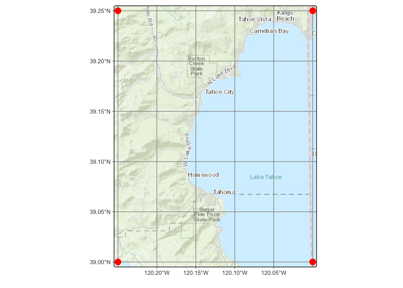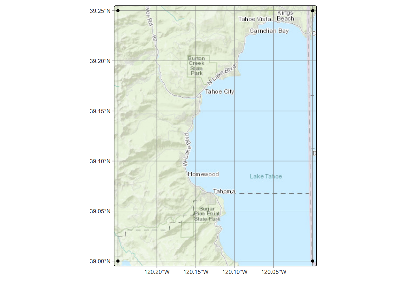 We’ll start with a simple test of tmap on a basemap, with coordinates of 4 points in the NW part of Lake Tahoe provided in code.