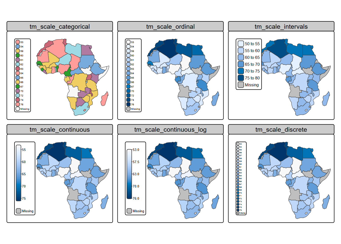 tm_layout(panel.labels = c("tm_scale_categorical", "tm_scale_ordinal", "tm_scale_intervals", "tm_scale_continuous", "tm_scale_continuous_log", "tm_scale_discrete"),