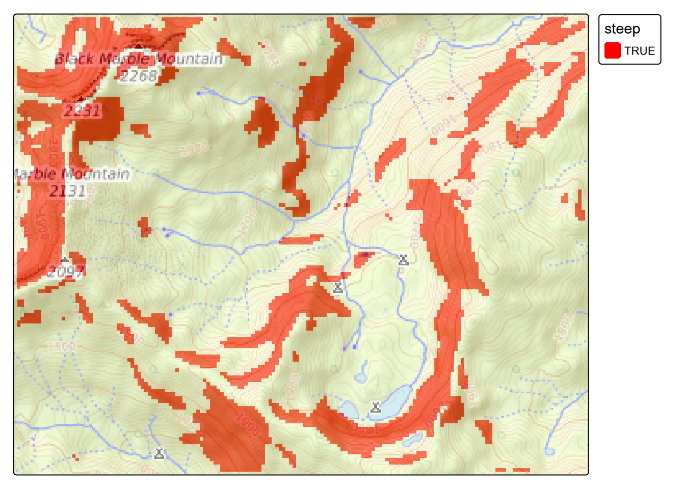 The tm_basemap method in the current tmap 4.0 version works fine with feature data, but to get a basemap when you want to display rasters as well requires another method, using maptiles::get_tiles and displaying that as a raster. To display rasters together requires an alpha setting, so we’ll use that with the basemap since it will need to go on top to scale correctly.