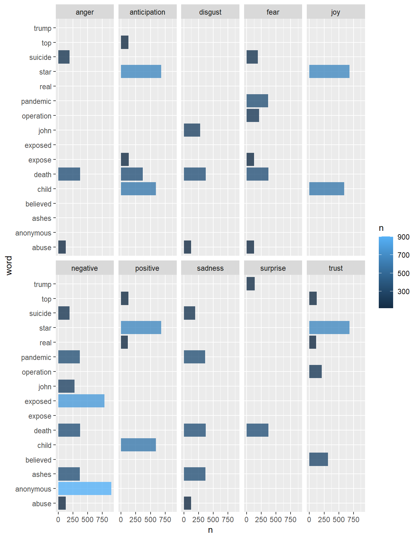 facet_wrap(~ sentiment, ncol = 5) ## Joining, by = "word"