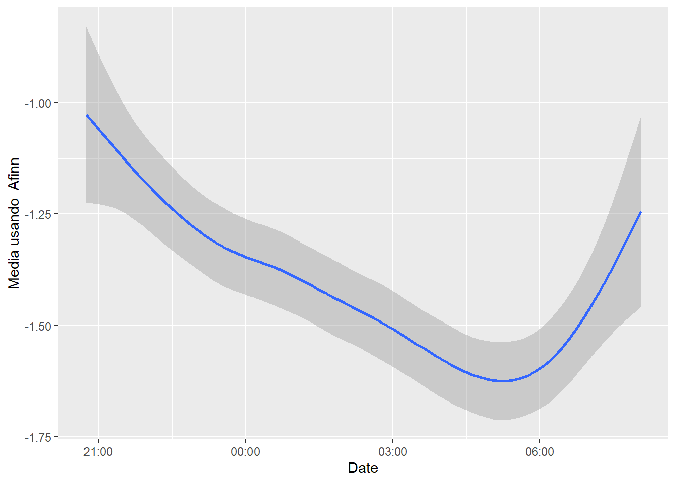 labs(x = "Date", y = "Media usando Afinn")## `geom_smooth()` using method = 'gam' and formula 'y ~ s(x, bs = "cs")'