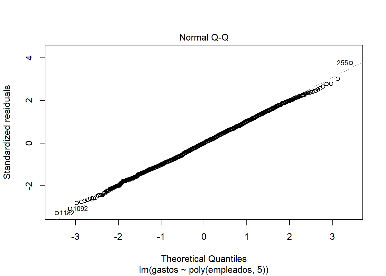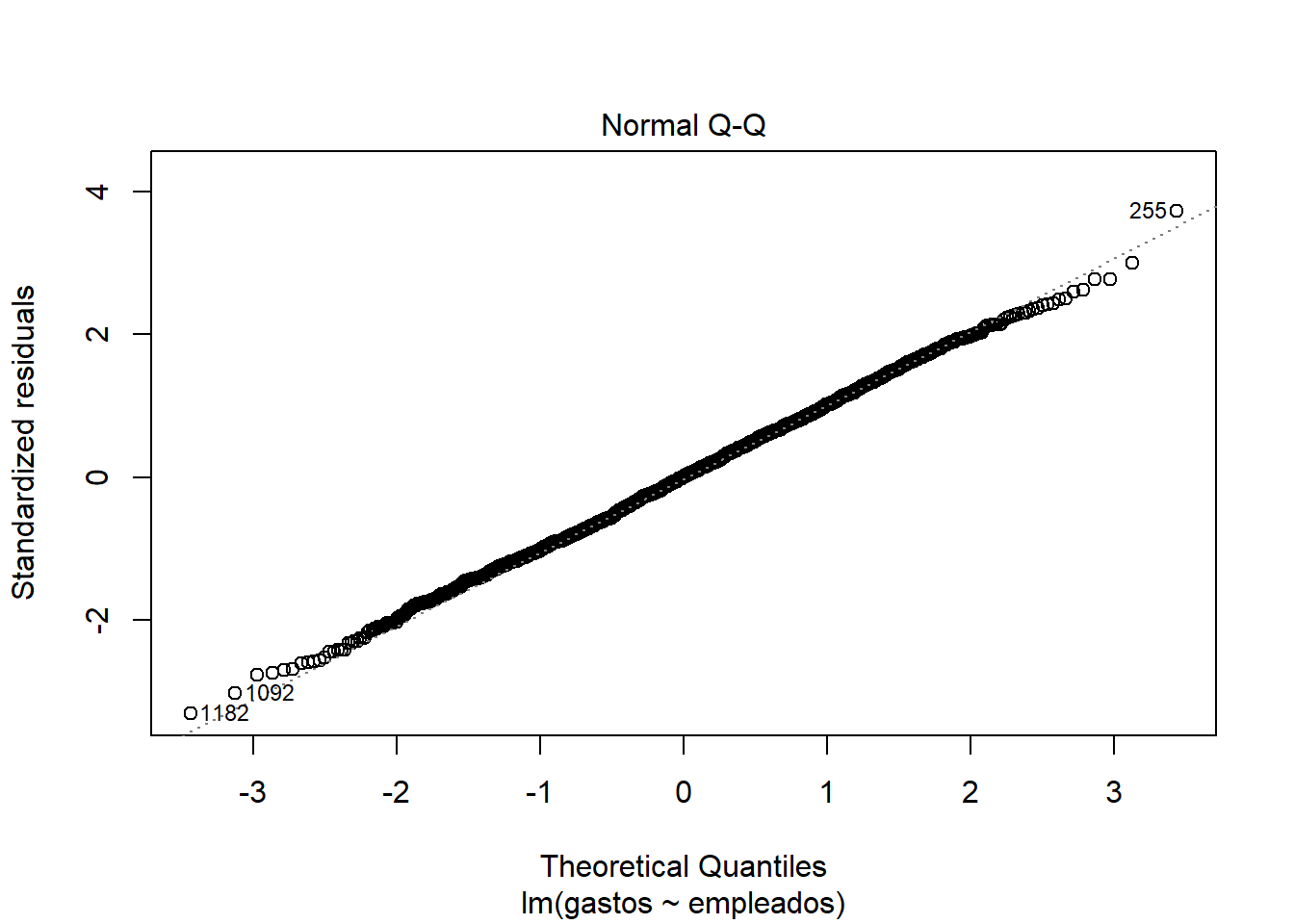 Como vemos, los residuos están prácticamente distribuidos siguiendo una normal, debido a que los puntos representativos de la gráfica se acercan (o simulan) la recta y=x. También detecta outliers y valores importantes (como 1182, 1092 y 255).