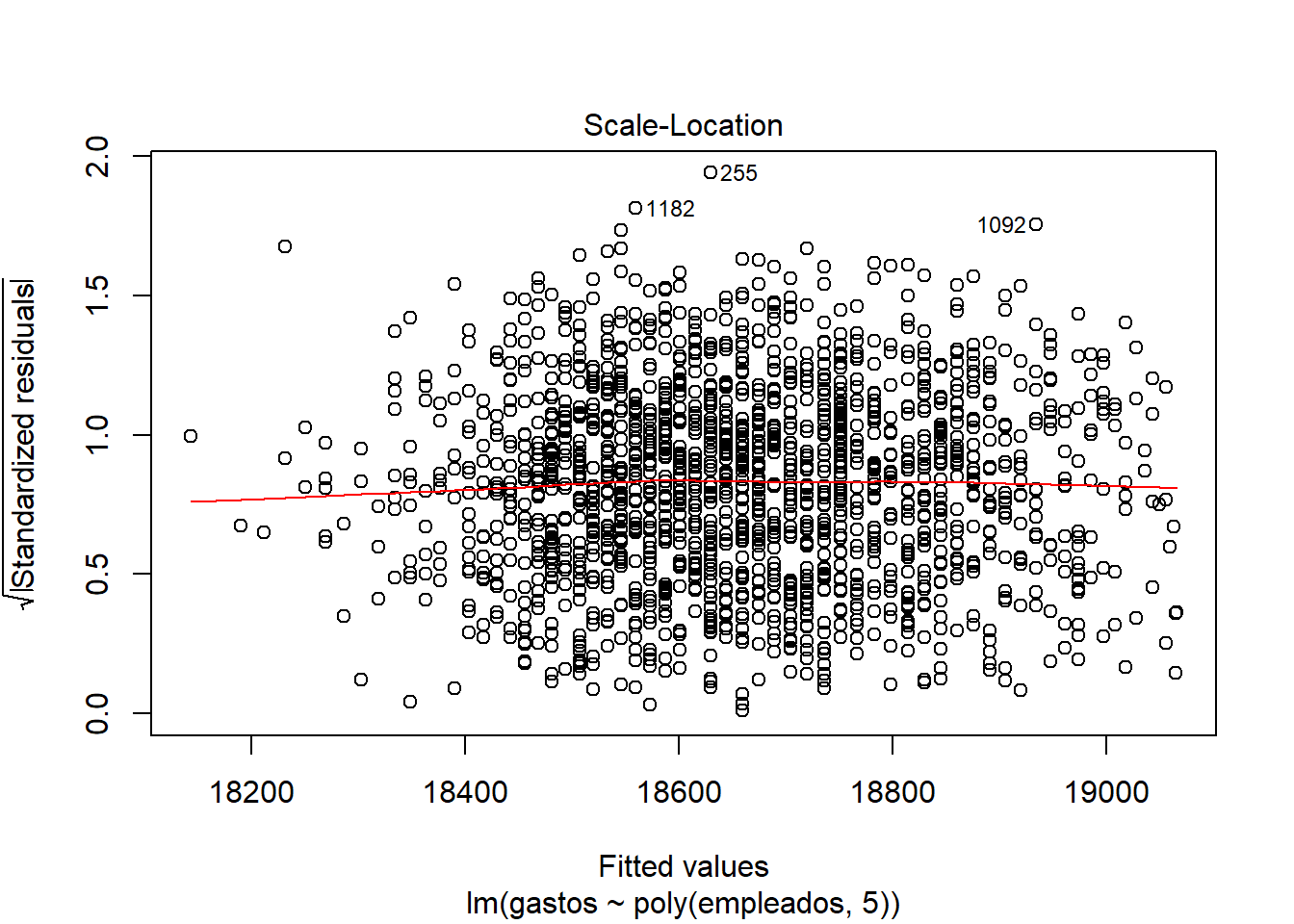 Enfrenta los residuos y los valores ajustados, cuanto más cerca esté la línea a y=0, mejor será la regresión. Al visualizar las gráfica 1 del modelo, parece que los residuos están linealmente distribuidos (cerca del y=0), pero si nos fijamos en las dimensiones del eje y (de 500 a -500) y de los errores en el summary, vemos que no es un buen modelo.