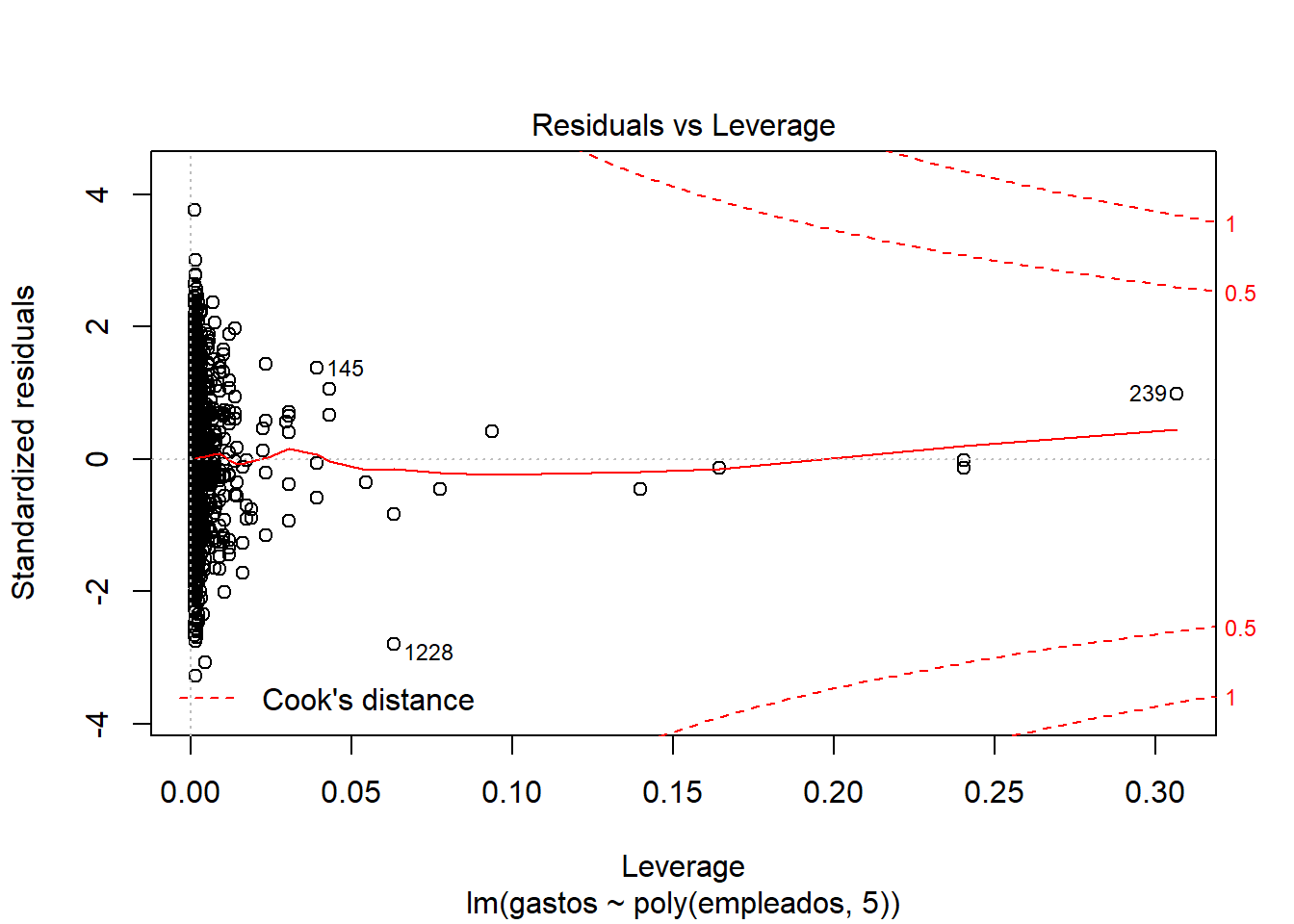 Distancia Cook –> Outliers, valores importantes: Como el 1228 o el 239.