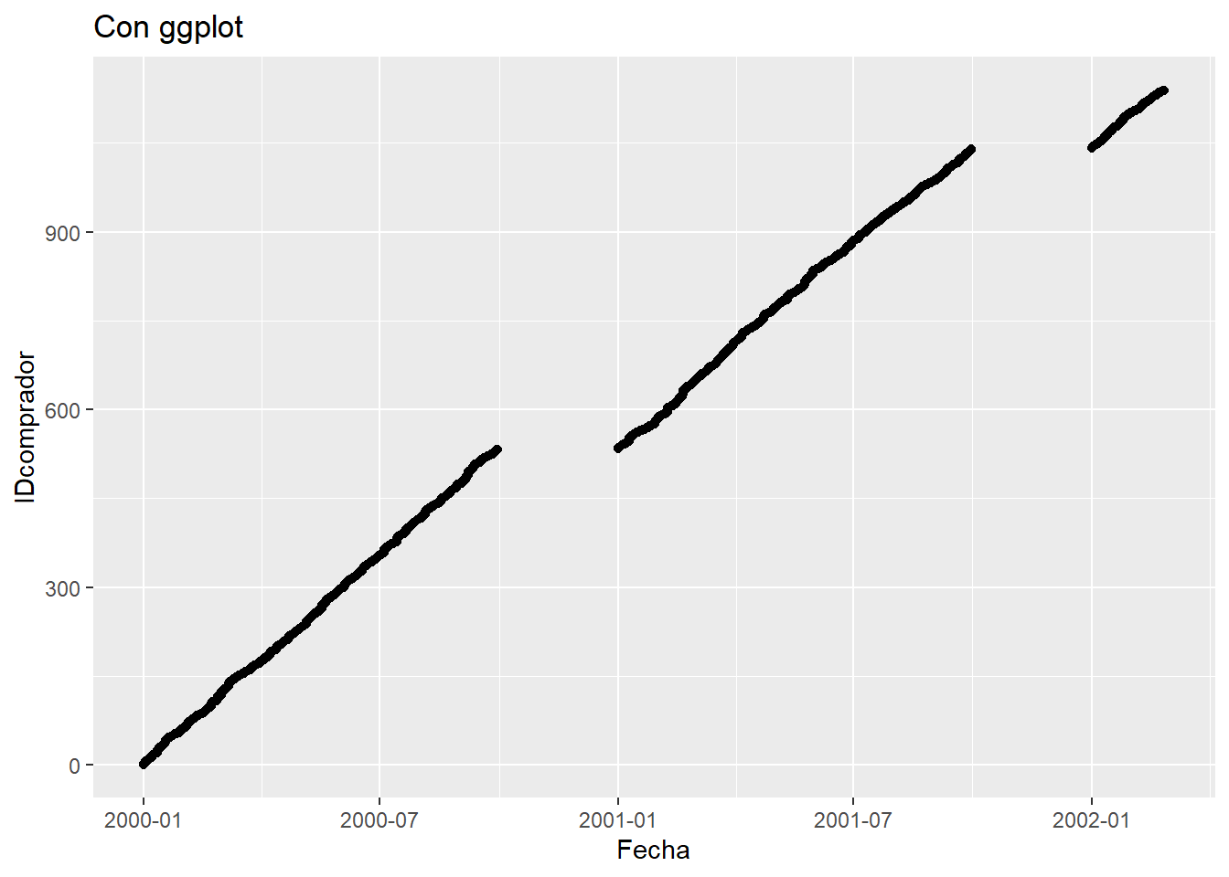 ggplot(onlinePlot, aes(Fecha, IDcomprador)) +