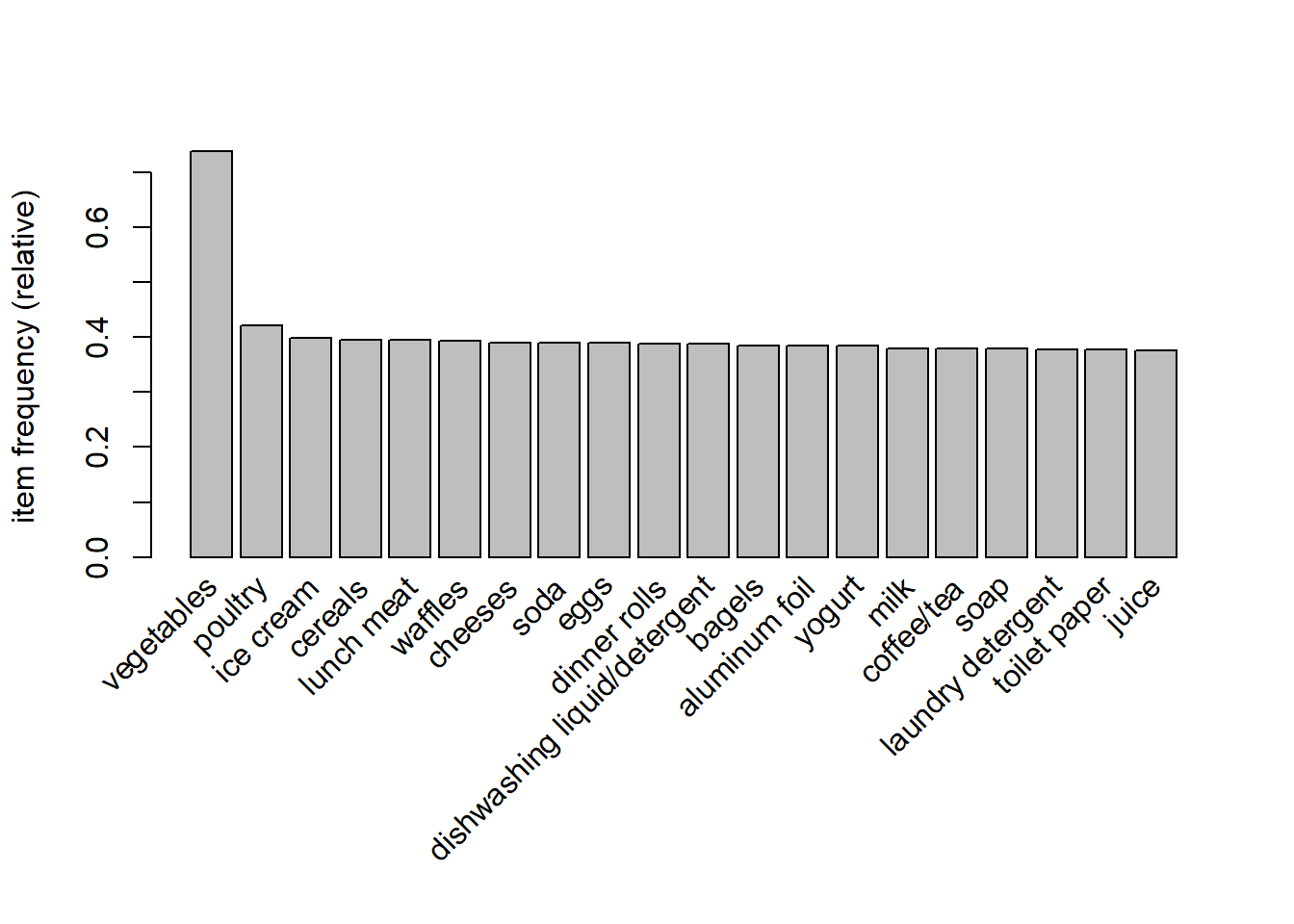 20 - Buscar ayuda de itemFrequencyPlot para visualizar las 20 transacciones más frecuentes.