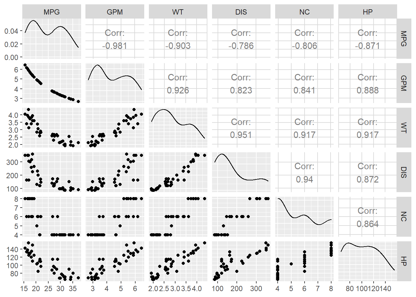 ## [1] "MPG" "GPM" "WT" "DIS" "NC" "HP"