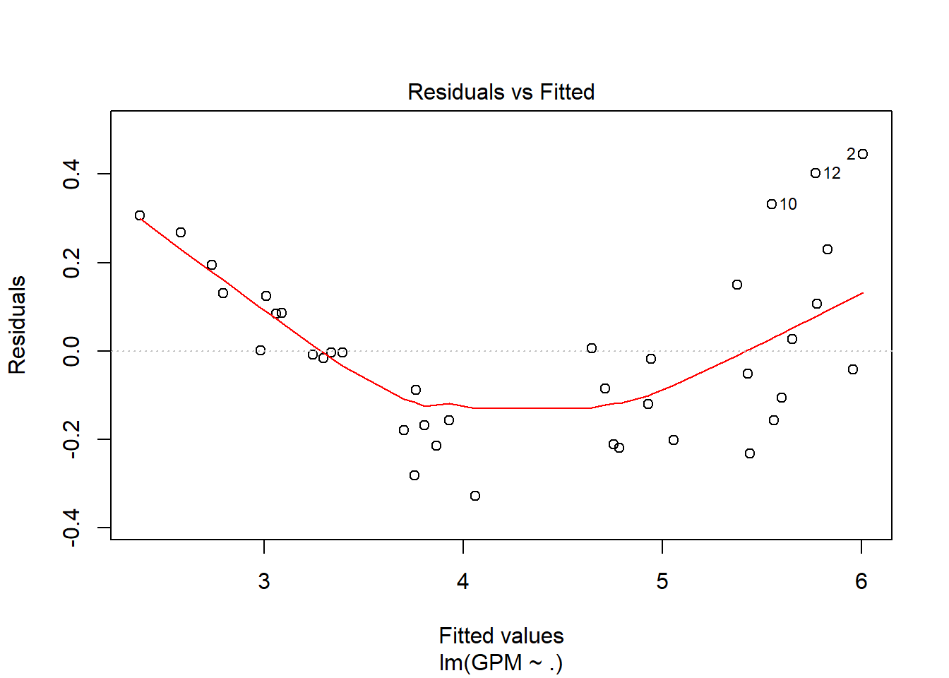 ## lm(formula = GPM ~ poly(MPG, 2), data = FuelEfficiency)
