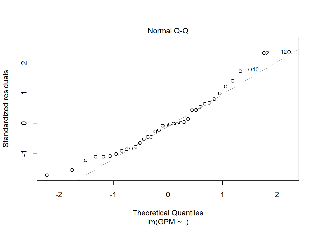 Los residuos están prácticamente distribuidos siguiendo una normal, debido a que los punto representativos de la gráfica se acercan (o simulan) la recta y=x. También detecta outliers y valores importantes.