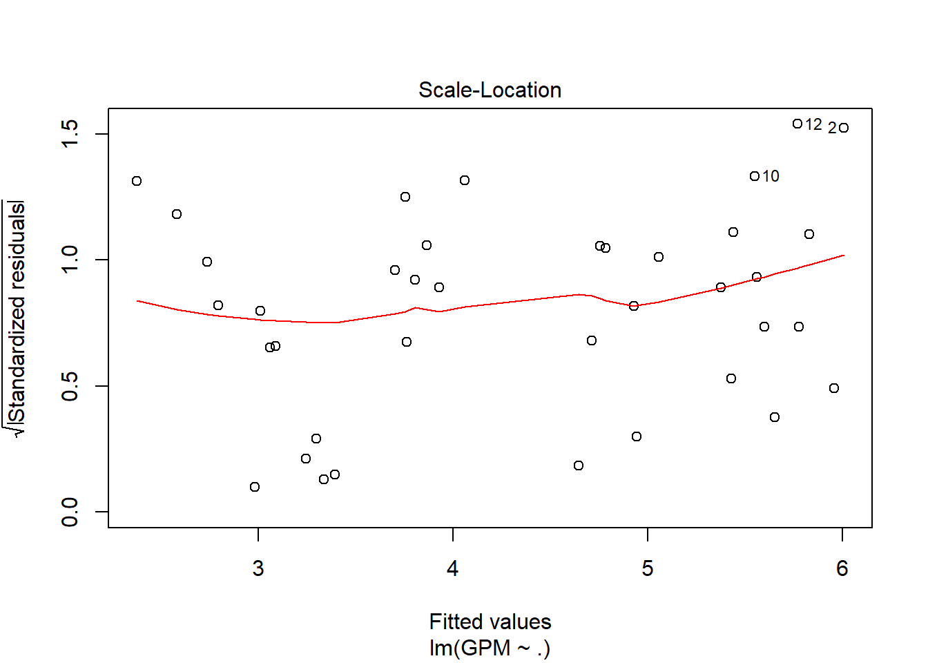 Residuals vs Fitted values: Los residuos están linealmente distribuidos, debido a que la línea de la gráfica se aproxima a y=0 (teniendo en cuenta además la escala del eje y, que va de -0.4 a 0.4).