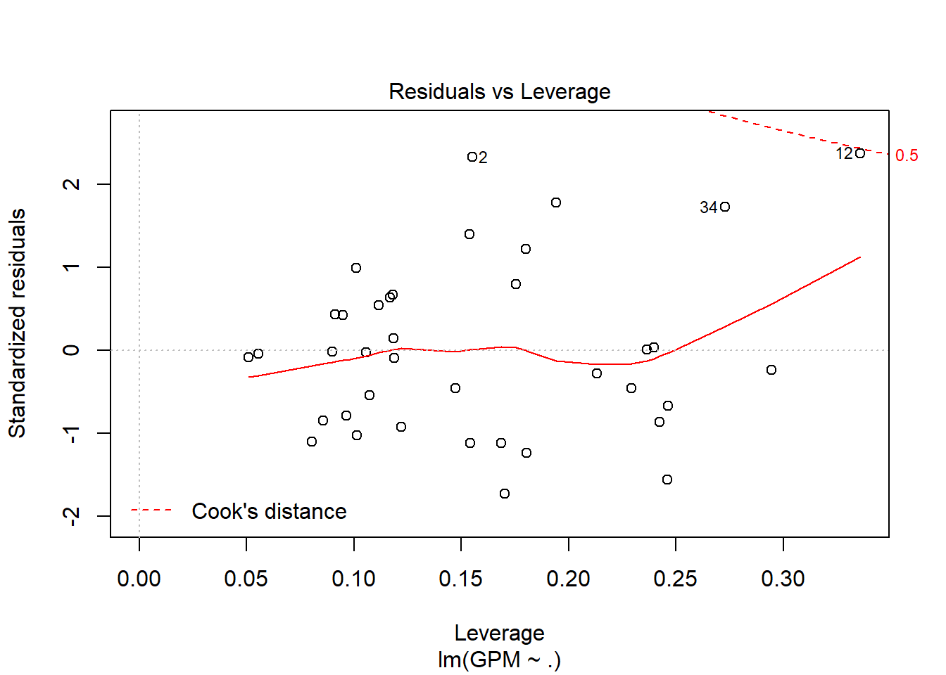 Con la distancia de Cook, detectamos outliers y valores importantes. Si en ambas gráficas (3 y 4) se marca el mismo punto podemos decir que tiene todas las papeletas para ser un outlier y poder así eliminarlo del conjunto de muestras.