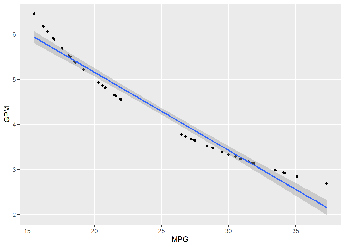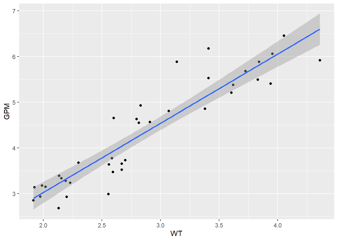 ## lm(formula = GPM ~ MPG + WT, data = FuelEfficiency)