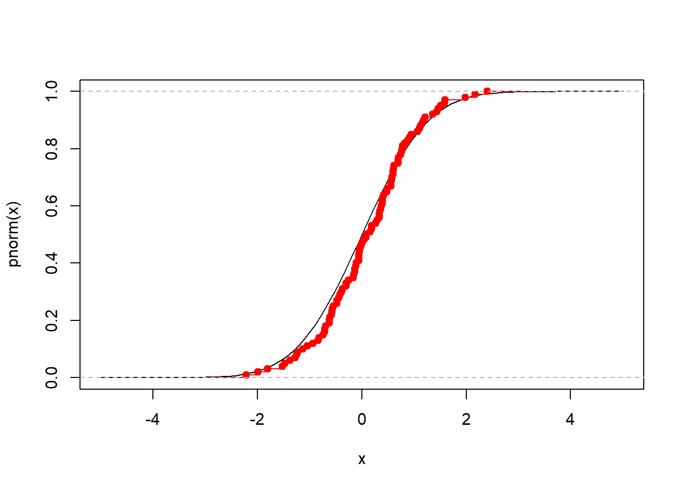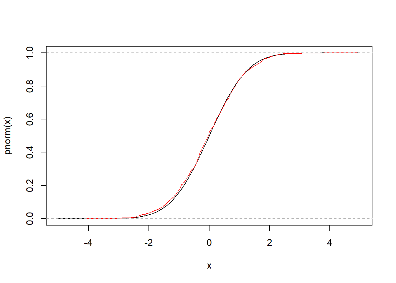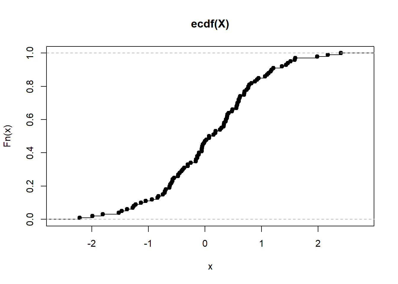 P = ecdf(X)P(0.0) # This returns the empirical CDF at zero (should be close to 0.5)## [1] 0.521