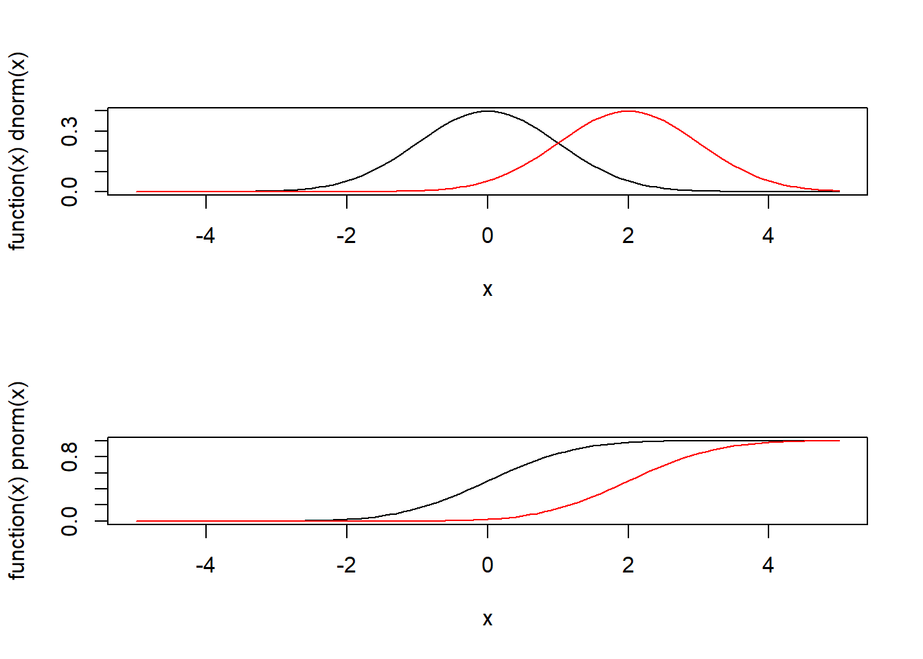 curve(pnorm(x,2), xlim = c(-5,5), add = TRUE, col = "red")