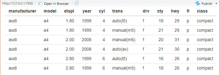 As an example, let’s work on on the mpg data frame. It is included in the ggplot2 package. Let’s say, we want to display the first 10 rows of the data frame.