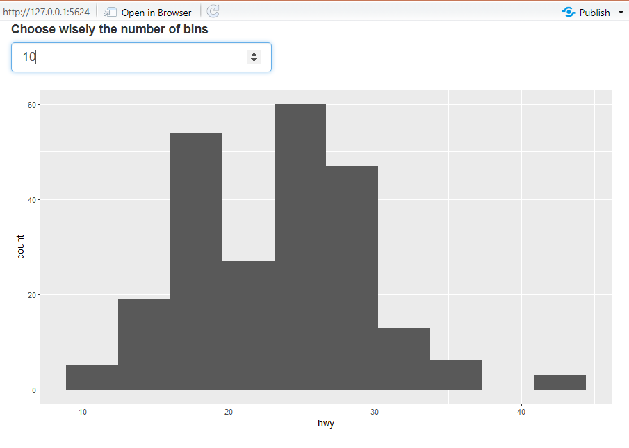 Suppose that we want to create a Shiny app that displays the distribution of the hwy variable from the mpg data frame (recall that the mpg object is attached to the ggplot2 package), and give the user the ability to choose the number of bins used to group the values in a histogram. We need an input from the user right ? as such we’ll use the shiny *Input() family functions. But wait a second, in order to get this input, we have to provide some space on our application allowing the user to introduce the value representing the number of bins. Therefore, it’s obvious that the *Input() functions will be coded inside the ui (user interface) object of our shiny app.