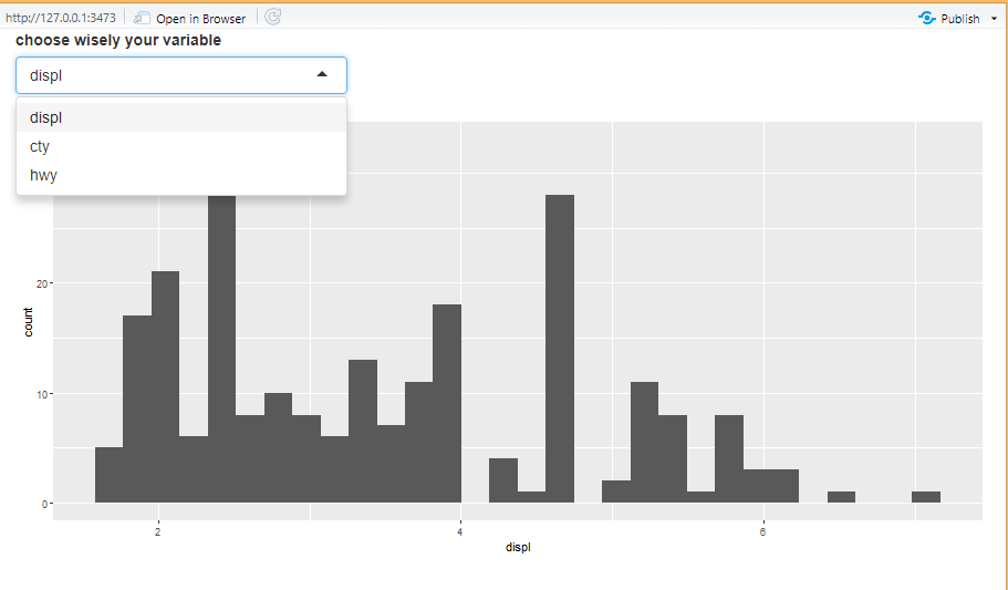 The above application is cool but it’s limited to plotting only one variable which is hwy. What if we could choose the variable to plot ? that would greatly improve the value added of the app. In order to achieve that the Shiny package has the selectInput() function. You provide a unique id, a label and a set of choices, in our cases the names of the quantitative (it’s a histogram) variables to plot. The mpg data frame is quite simple, we can provide the variables’ list manually.