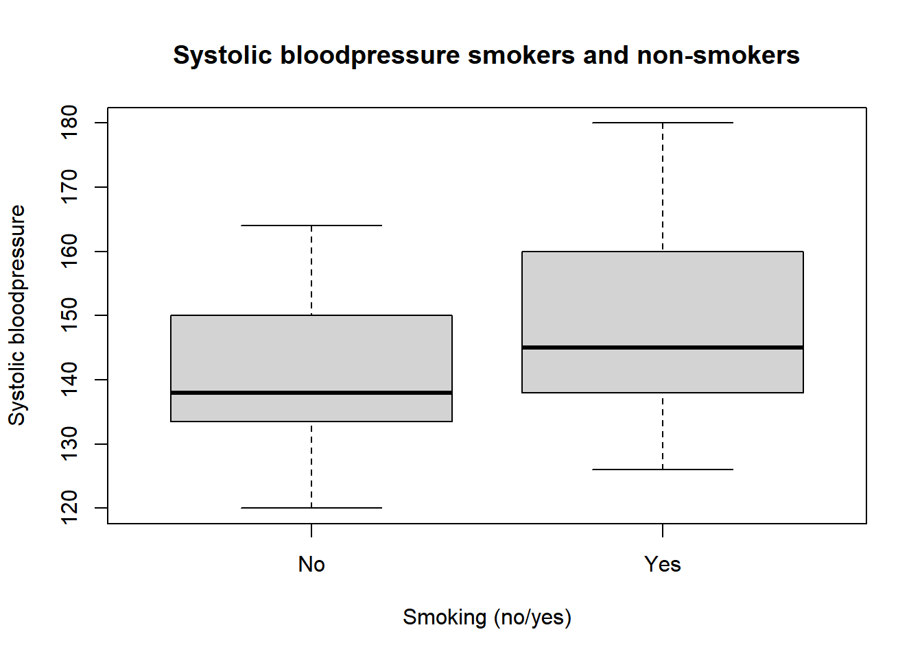 main = "Systolic bloodpressure smokers and non-smokers", xlab = "Smoking (no/yes)", ylab = "Systolic bloodpressure")