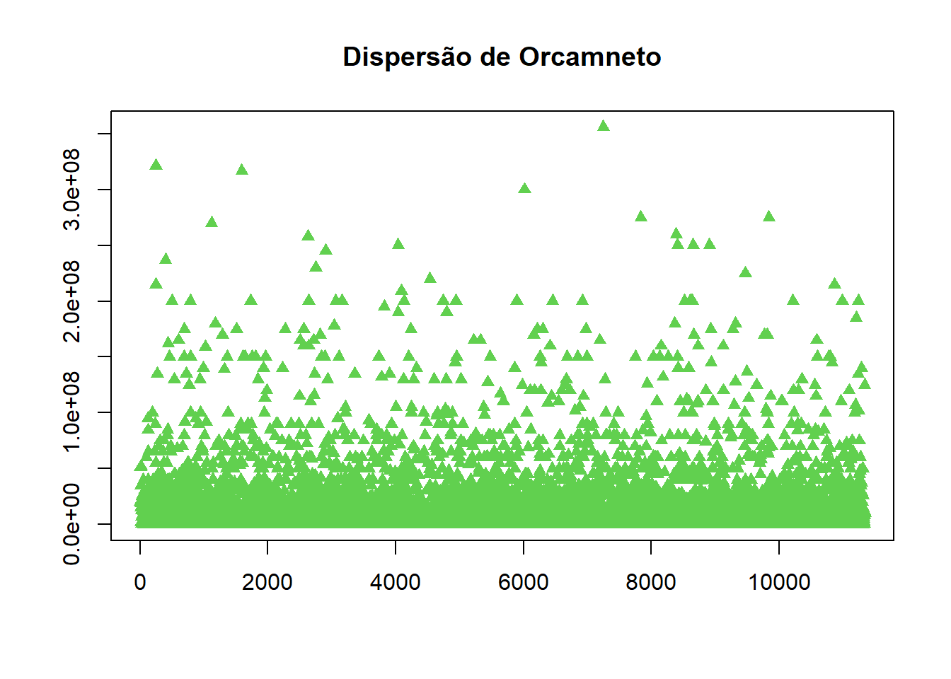 plot(imdb$orcamento,xlab="", ylab = "", col = 3, pch = 17, lower.panel=NULL,main="Dispersão de Orcamneto")