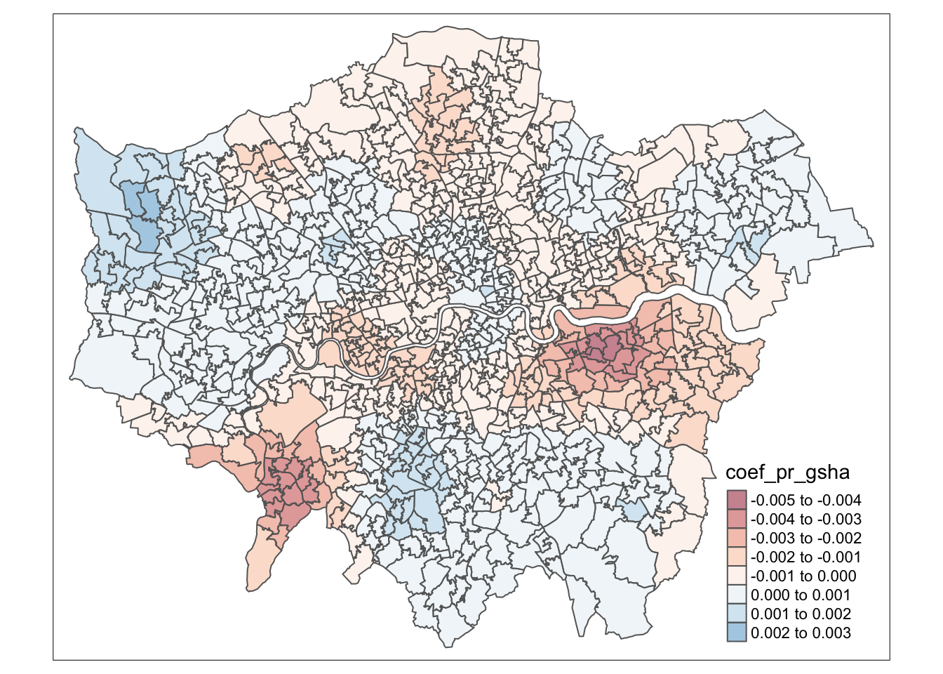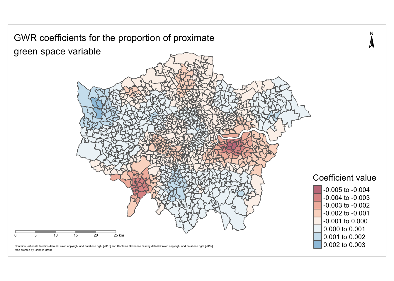 Map of the GWR coefficients for the proportion of proximate green space across London: