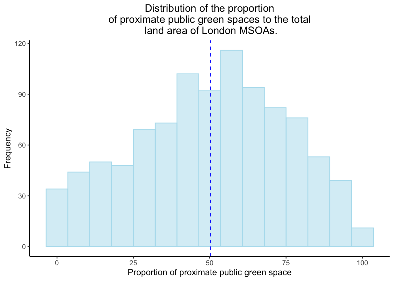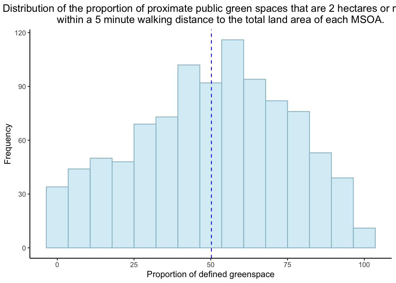 Looking at the distribution for the proportion of proximate public green space in each MSOA, it can be concluded that it is of a normal distribution.