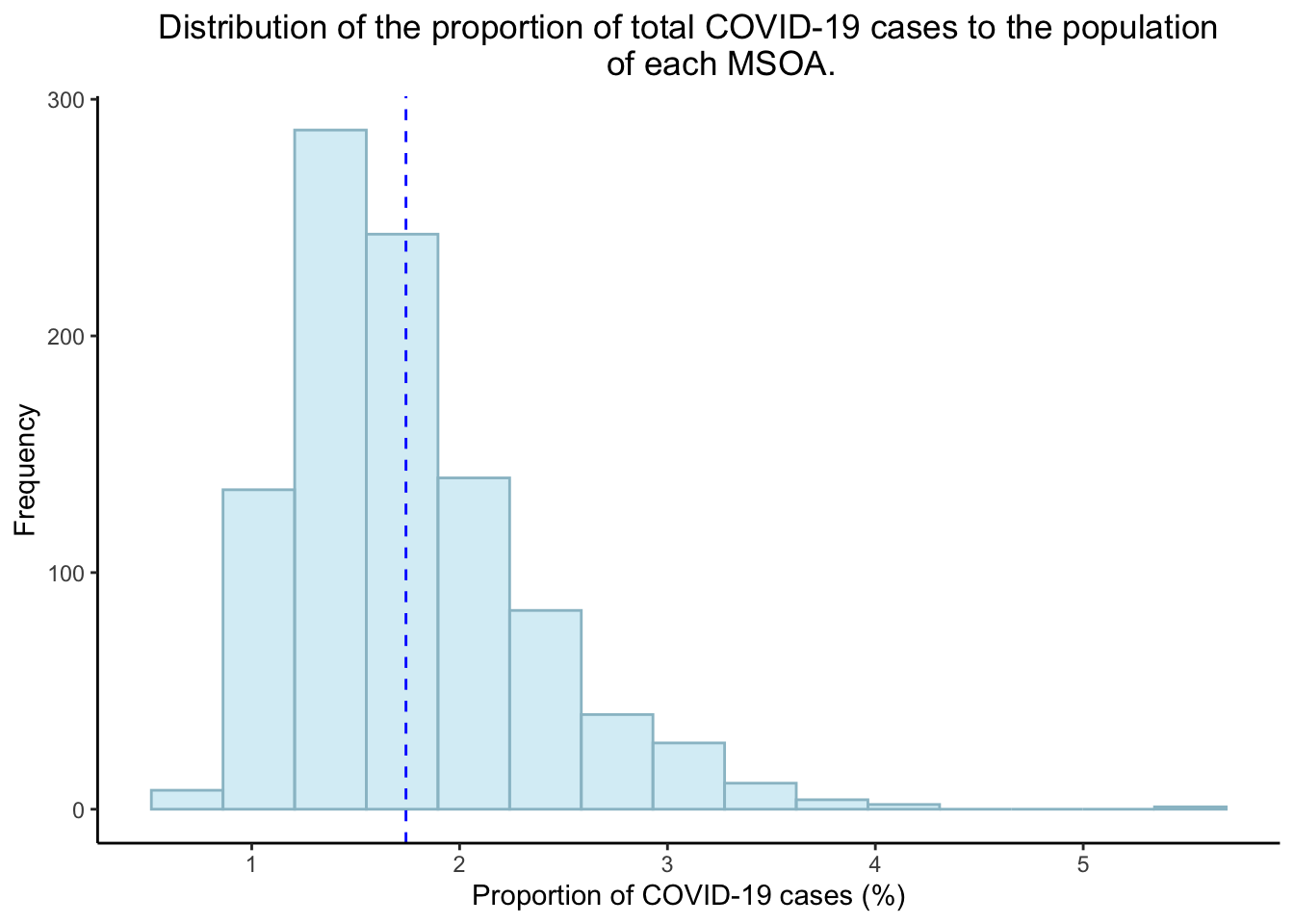 Histogram of the proportion of COVID-19 in London MSOAs:
