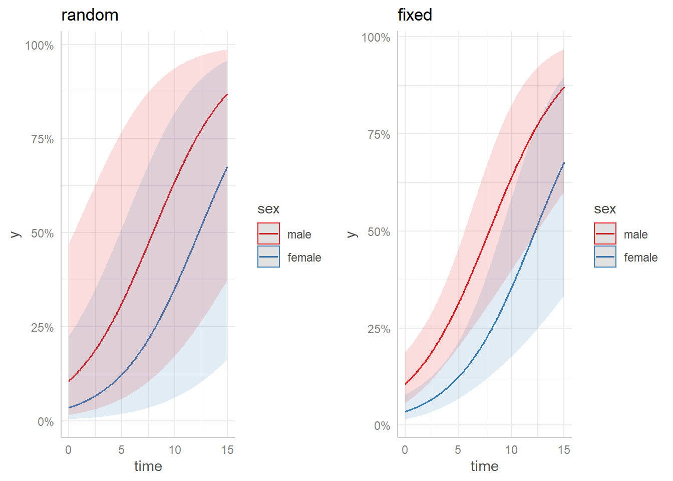 Fíjate que las constante aleatoria \(\beta_{0i}\) es distinto en el numerador que en denominador ya que el individuo está anidado a la variable sexo cada individuo es de una categoría de sexo pero no puede ser de ambas.