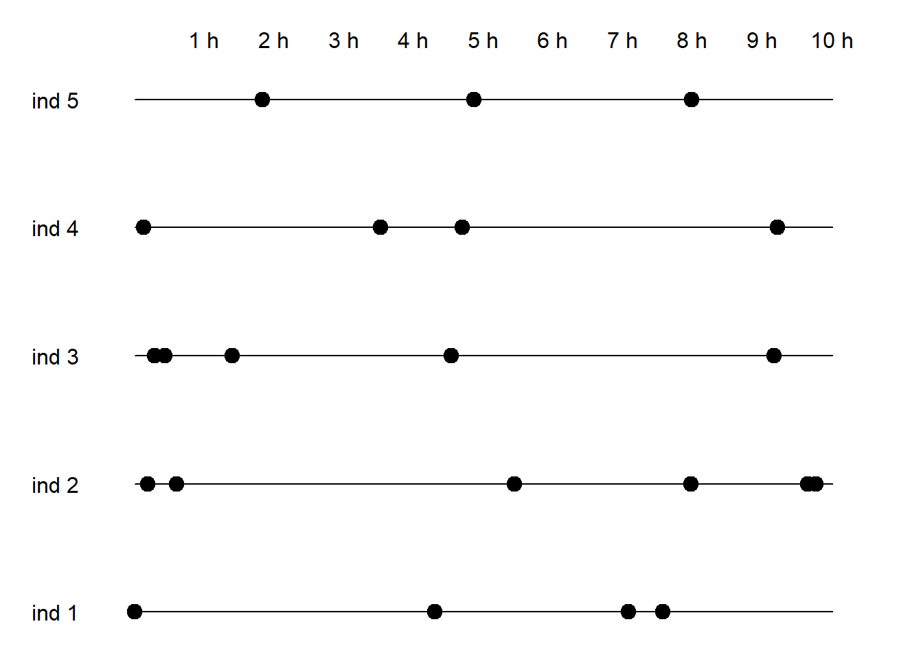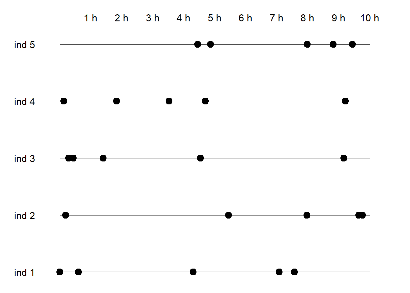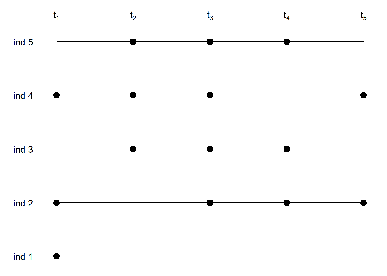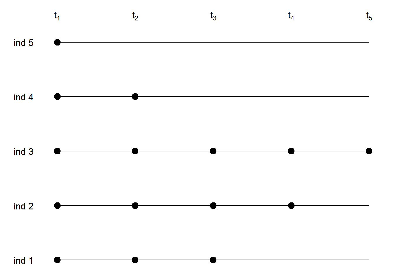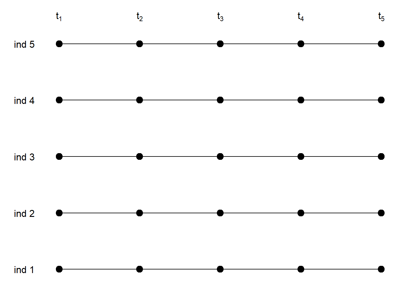 Medidas tomadas en los momentos \(t_1\), \(t_2\), …, \(t_5\). El intervalo transcurrido entre dos medidas puede ser constante o no. Pero son las mismas para todos los individuos. En caso que el intervalo no sea constante es importante anotar en qué momentos (segundos, minutos, horas, días, o metros…) se han hecho las medidas.