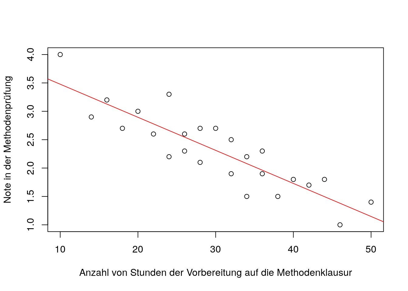 Die beiden Variablen scheinen in einem negativen, linearen Zusammenhang zueinander zu stehen (Merke: Der Zusammenhang ist negativ, weil auf der Variable ,,Prüfungsnote’’ eine niedrige Ausprägung für eine bessere Leistung steht). Insofern scheint eine einfache lineare Regression sinnvoll zu sein.