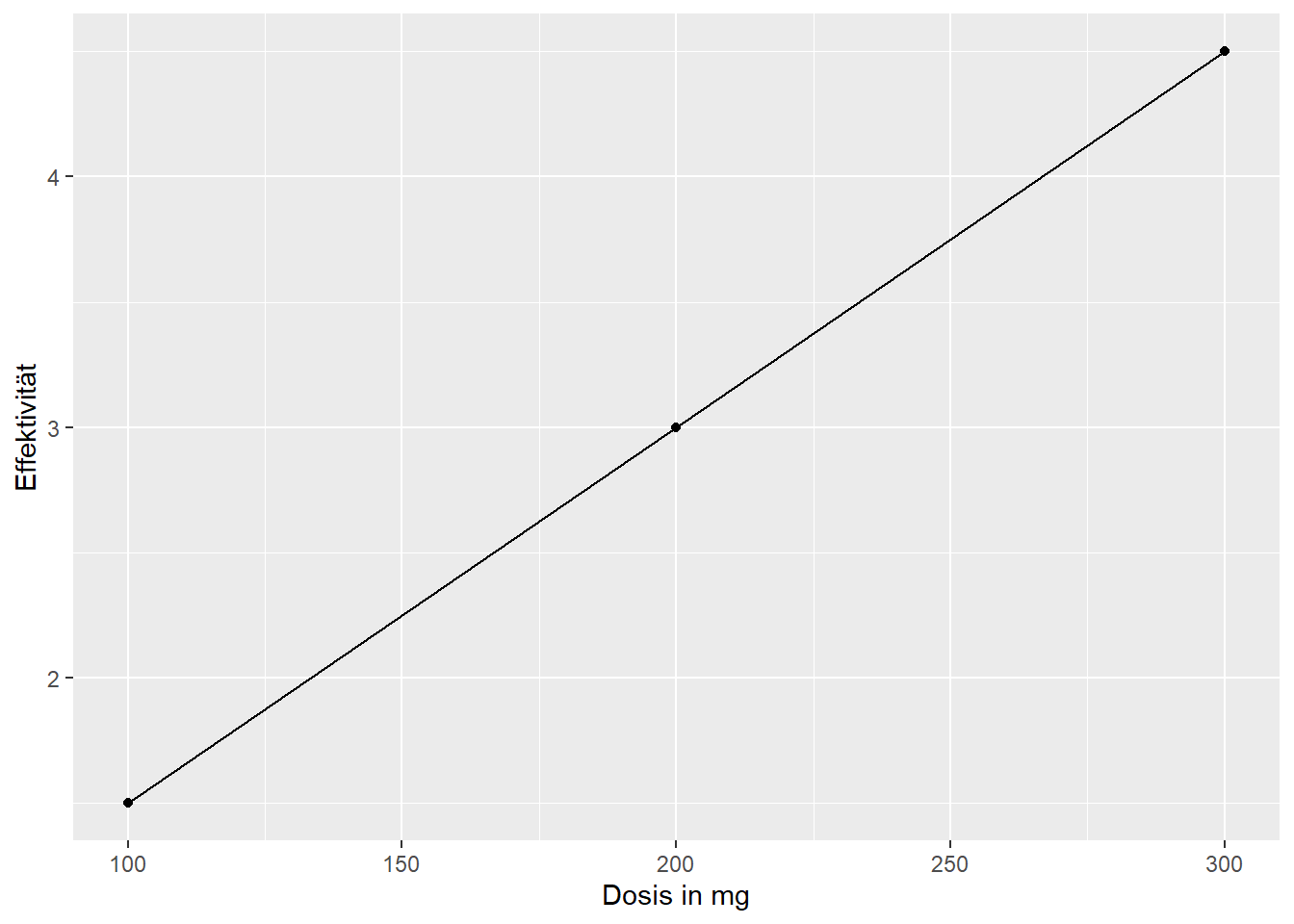 Wie bereits vorhin erwähnt ist es möglich Trendverläufe von Gruppen zu untersuchen. Stellene wir uns vor, wir möchten den Effekt eines Medikaments in unterschiedlichen Dosen untersuchen und erhalten folgende Mittelwerte für \(n=10\) Probanden pro Dosisgruppe: