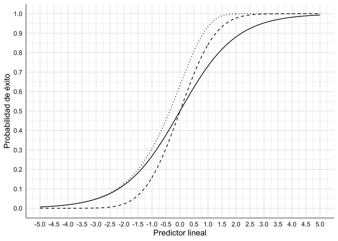 - linealidad entre transformaciones de la proporción de éxitos y de las variables explicativas continuas (función link)