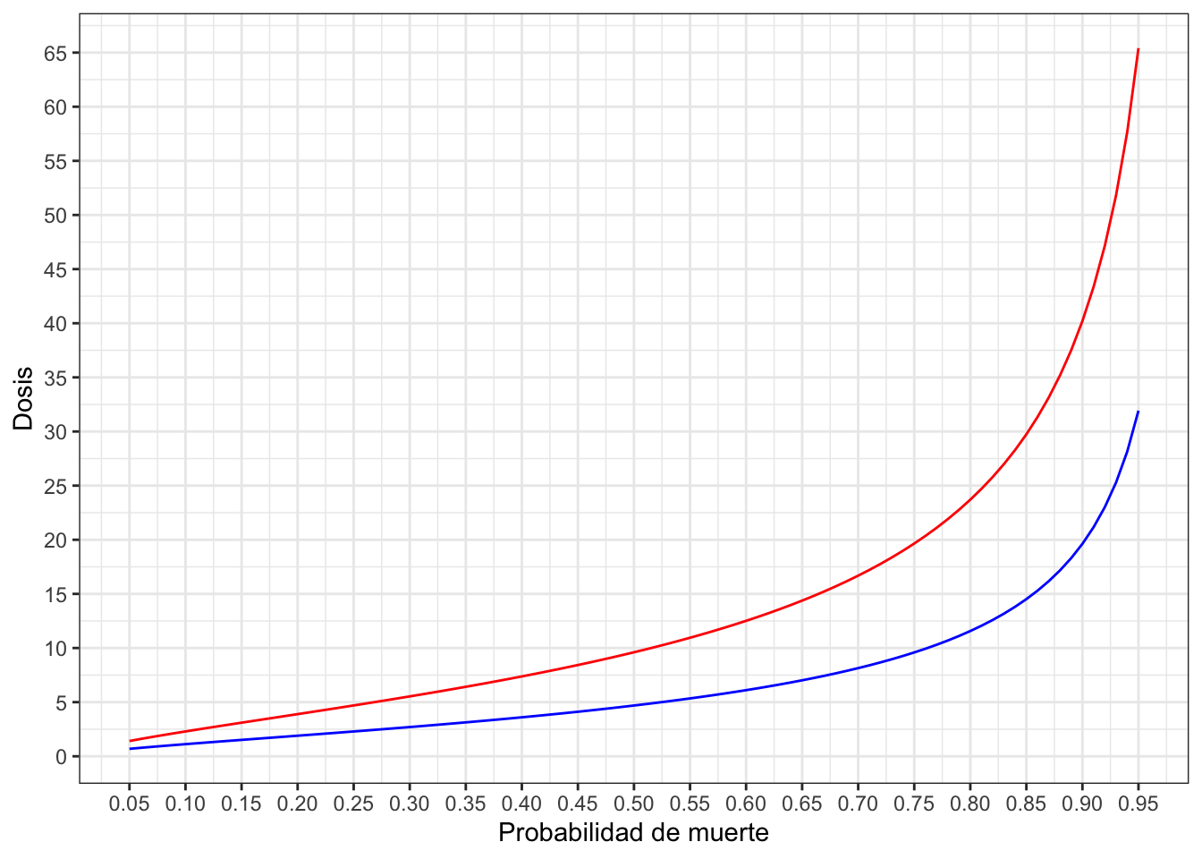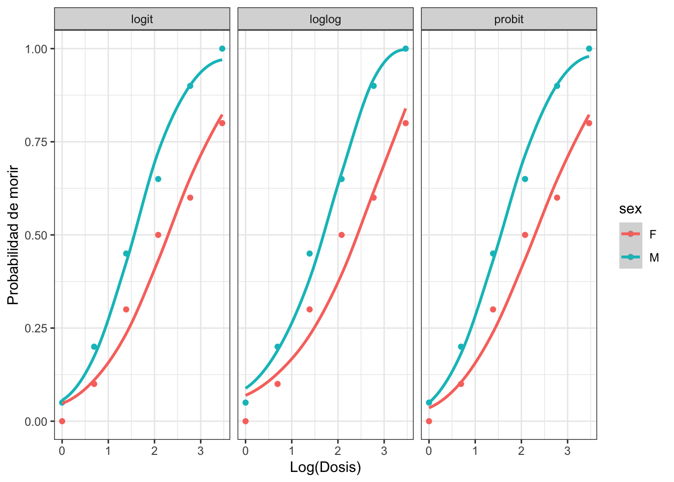 En los perfiles obtenidos se aprecia claramente el paralelismo entre ambos sexos, mostrando que las hembras son más resistentes (probabilidad de morir más baja) para todos los niveles de dosis considerados, y que la probabilidad de morir aumenta con la dosis suministrada.