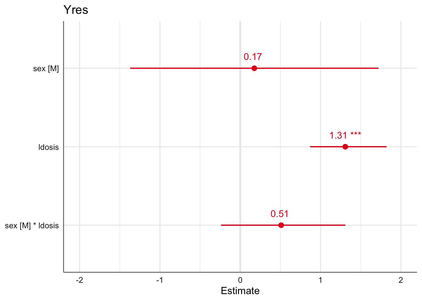 Se observa que para la misma dosis la probabilidad de morir en las hembras es menor que en los machos. Además, hay una tendencia creciente con la dosis, es decir, cuanto aumenta la dosis aumenta la probabilidad de morir.