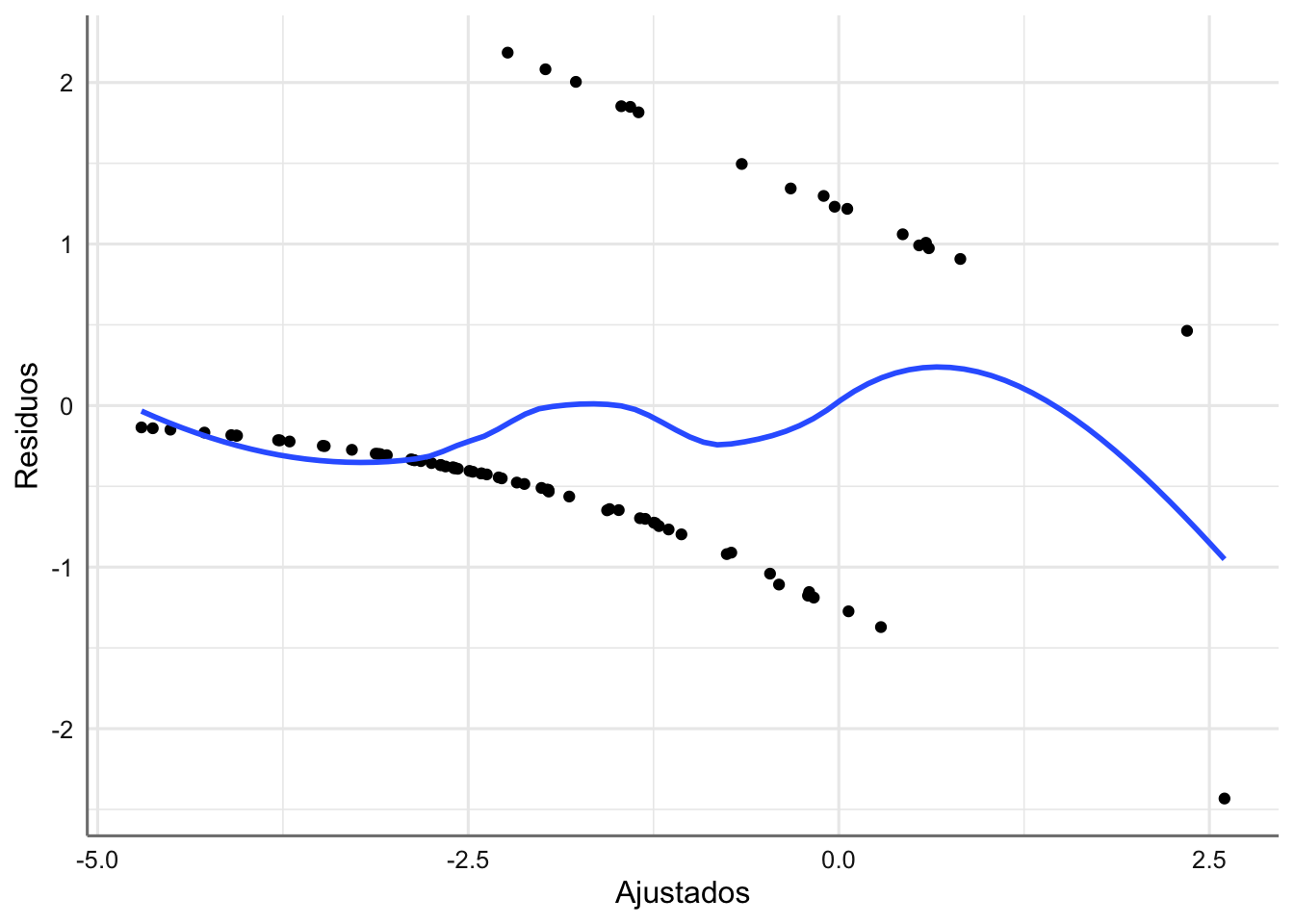 En este caso no hemos ajustado las tendencias, ya que dado el tamaño de muestra tan pequeño en cada uno de los grupos, los resultados podrían mostrar tendencias ficticias que nos podrían hacer dudar de la validez del modelo. En este caso no se puede afirmar que exista ningún tipo de tendencia destacable. Tampoco se registra ninguna observación influyente.