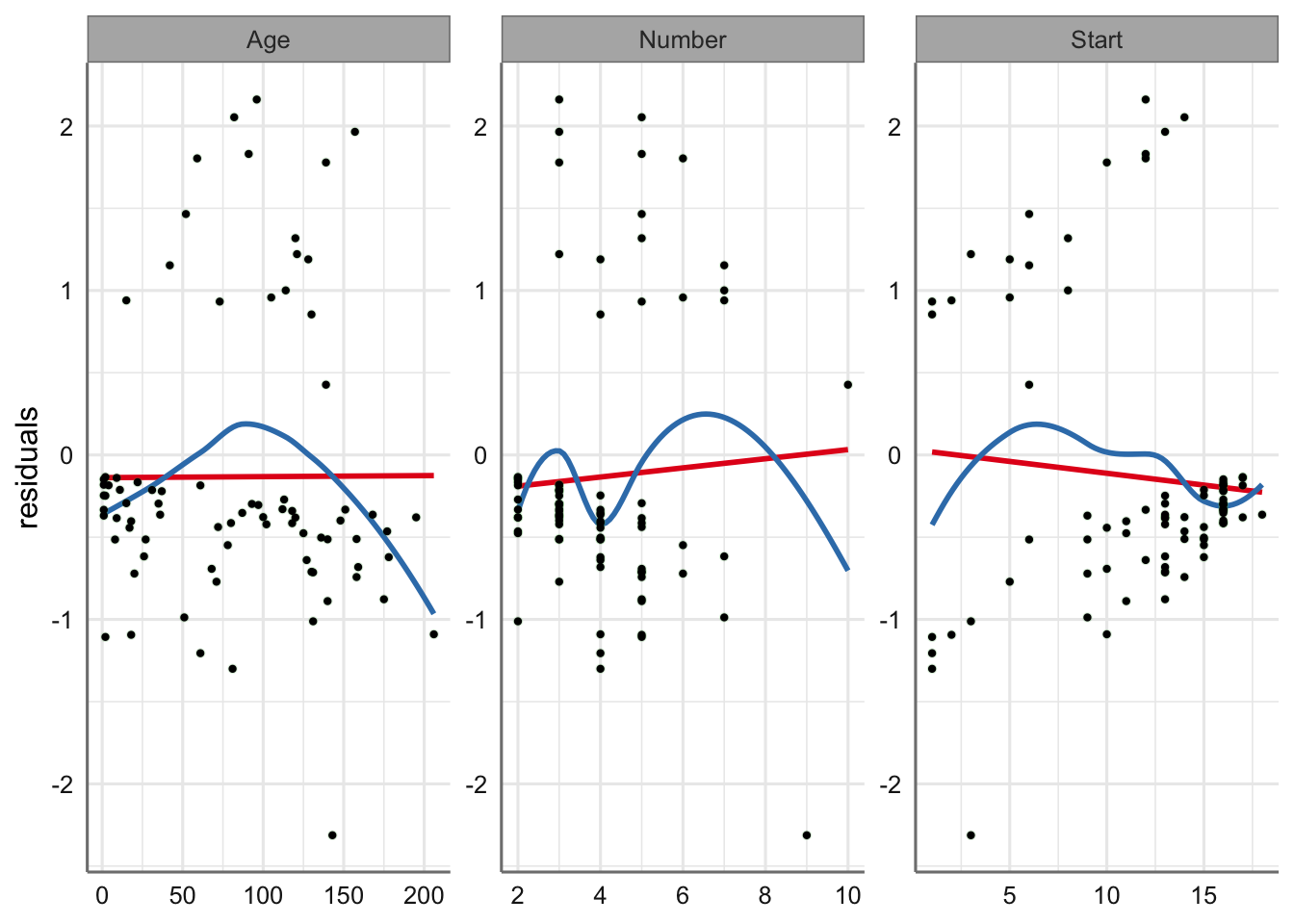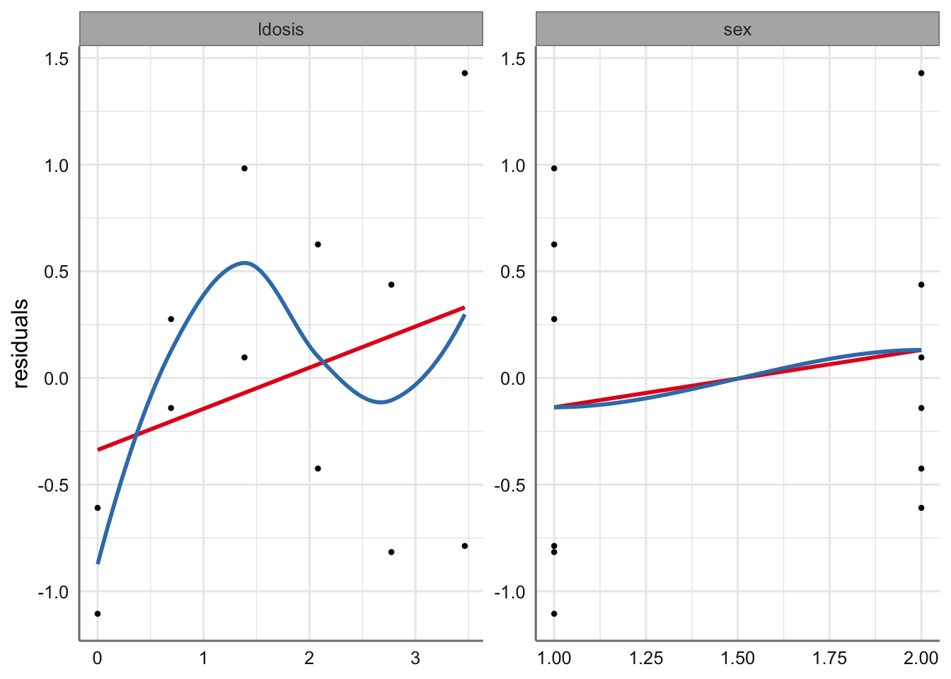 En los gráficos de residuos versus predictoras ocurre algo similar, ya que el número de observaciones es tan bajo que las posibles tendencias observadas no implican una modificación del modelo planteado. Dado el número tan bajo de observaciones el planteamiento de modelos con suavizado sobre dosis no resulta una opción.