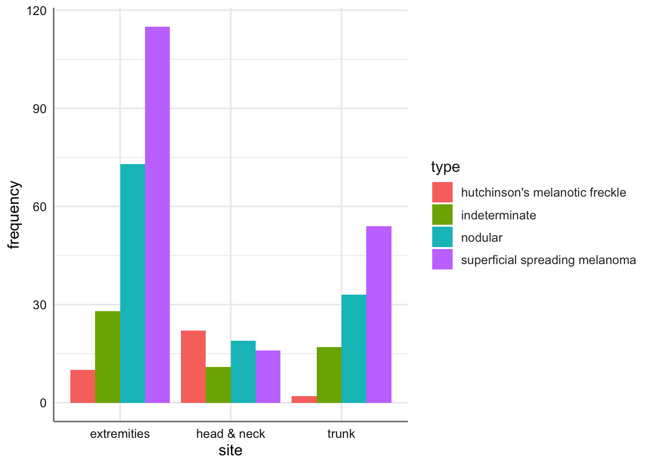 ggplot(Melanoma, aes(x = site, y = frequency, fill = type)) +