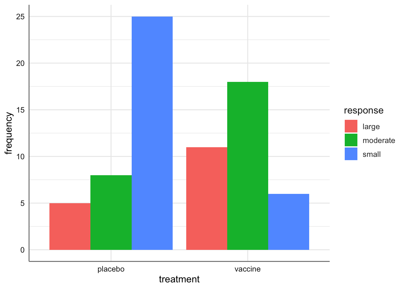 ggplot(Gripe, aes(x = treatment, y = frequency, fill = response)) +